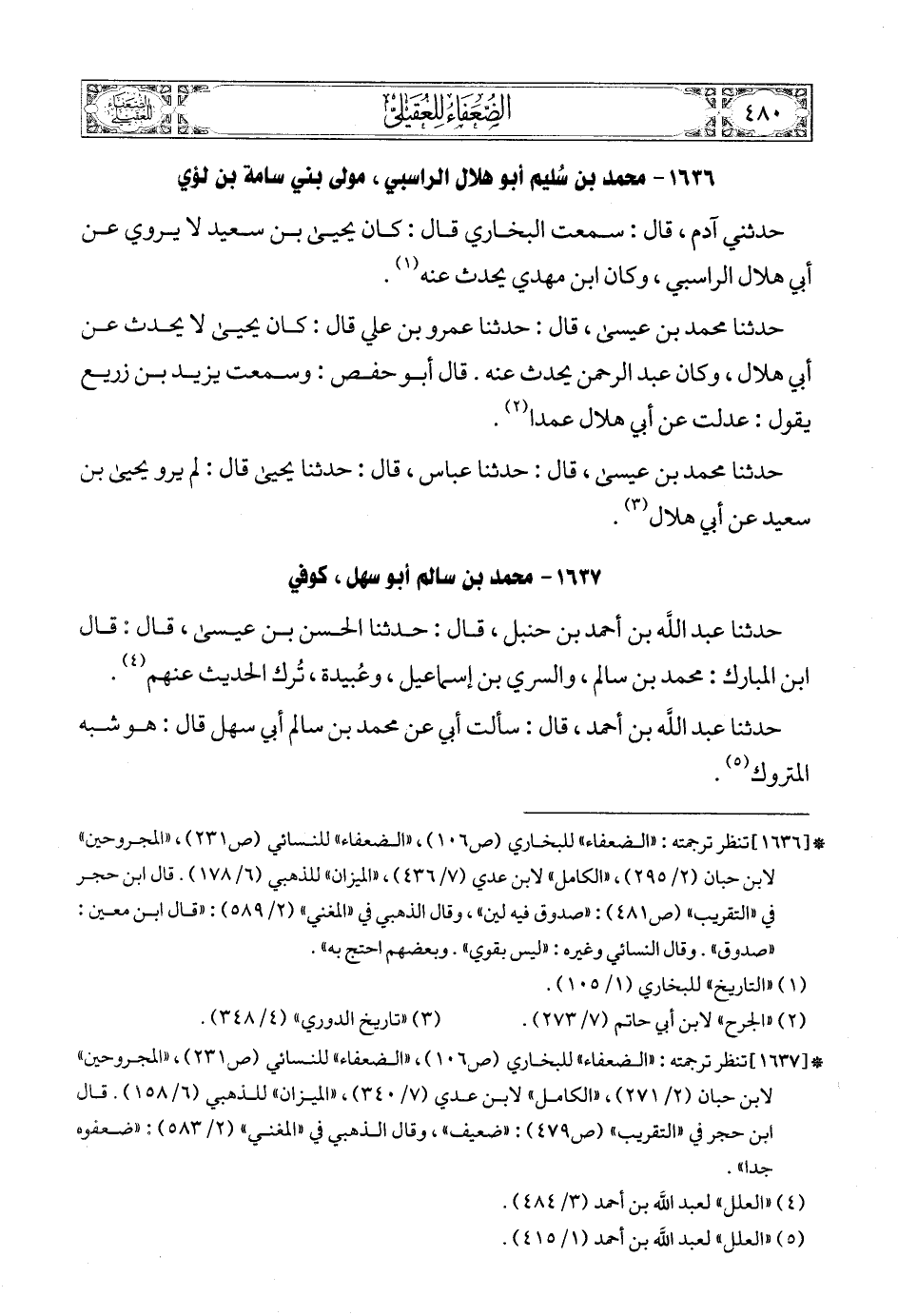 (5) * [1637] تنظر ترجمته: «الضعفاء» للبخاري (ص106) , «الضعفاء» للنسائي (ص231) , «المجروحين» لابن حبان (2/ 271) , «الكامل» لابن عدي (7/ 340) , «الميزان» للذهبي (6/ 158). قال ابن حجر في «التقريب» (ص479): «ضعيف» , وقال الذهبي في «المغني» (2/ 583): «ضعفوه جدا».