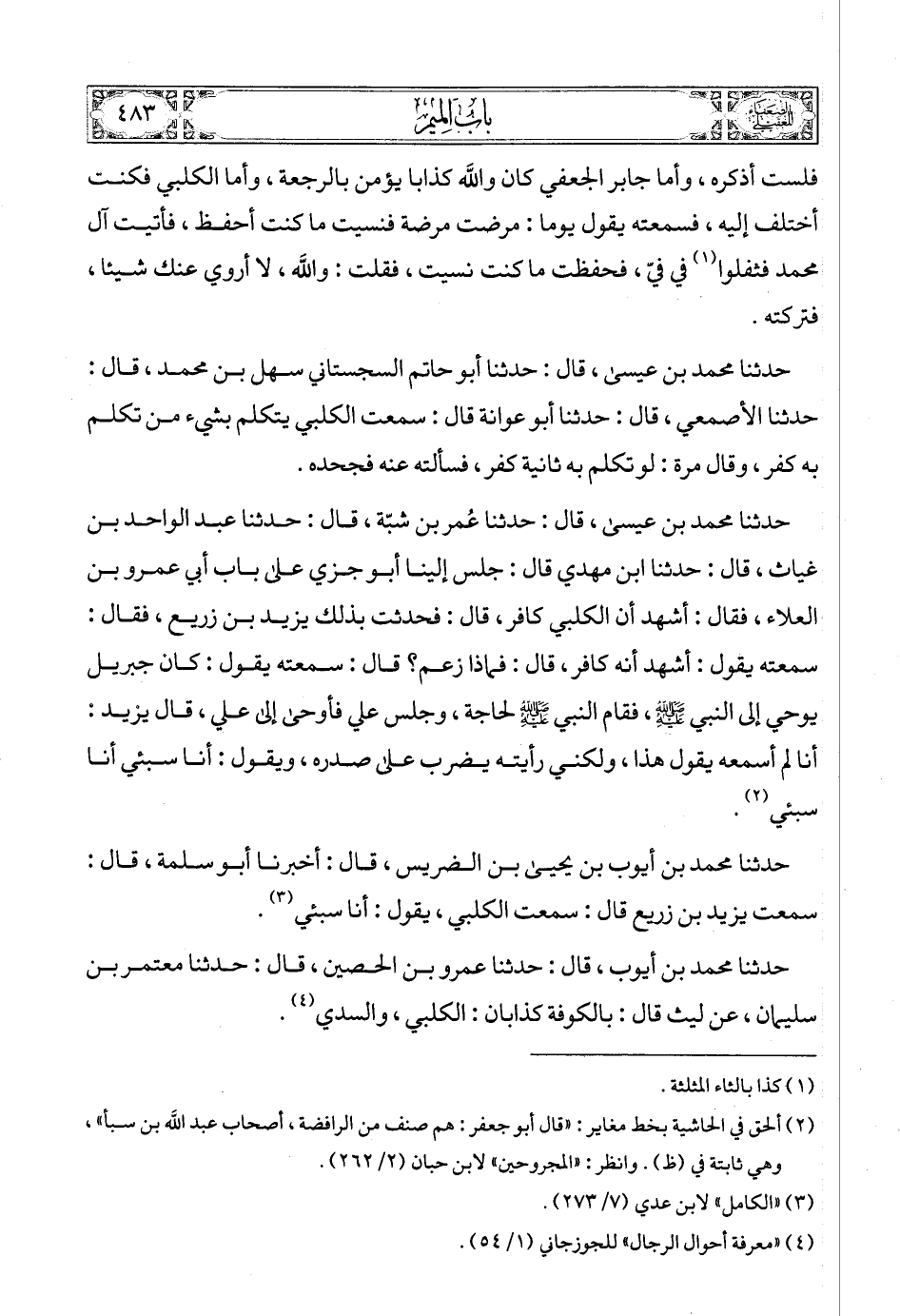 حدثنا محمد بن عيسى، قال: حدثنا عُمر بن شبّة، قال: حدثنا عبد الواحد بن غياث، قال: حدثنا ابن مهدي قال: جلس إلينا أبو جزي على باب أبي عمرو بن العلاء، فقال: أشهد أن الكلبي كافر، قال: فحدثت بذلك يزيد بن زريع، فقال: سمعته يقول: أشهد أنه كافر، قال: فماذا زعم؟ قال: سمعته يقول: كان جبريل يوحي إلى النبي صلى الله عليه وسلمع، فقام النبي صلى الله عليه وسلمع لحاجة، وجلس علي فأوحى إلى علي، قال يزيد: أنا لم أسمعه يقول هذا، ولكني رأيته يضرب على صدره، ويقول: أنا سبئي أنا سبئي (2).