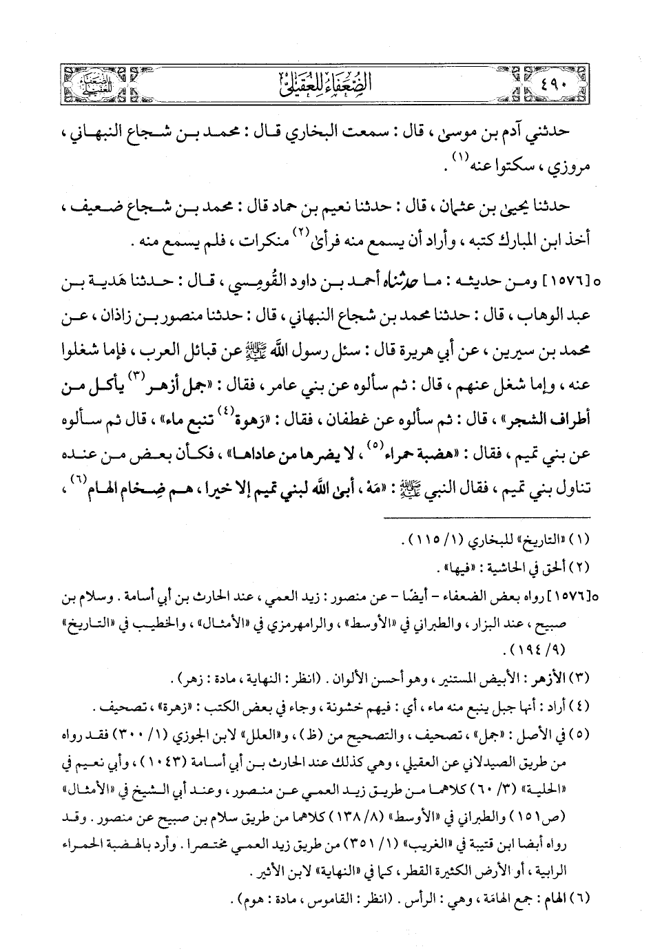 [1576] (3) ومن حديثه: ما حدثناه أحمد بن داود القُومِسي، قال: حدثنا هَدية بن عبد الوهاب، قال: حدثنا محمد بن شجاع النبهاني، قال: حدثنا منصور بن زاذان، عن محمد بن سيرين، عن أبي هريرة قال: سئل رسول الله صلى الله عليه وسلمع عن قبائل العرب، فإما شغلوا عنه، وإما شغل عنهم، قال: ثم سألوه عن بني عامر، فقال: «جمل أزهر (4) يأكل من أطراف الشجر»، قال: ثم سألوه عن غطفان، فقال: «رَهوة (5) تنبع ماء»، قال ثم سألوه عن بني تميم، فقال: «هضبة حمراء (6)، لا يضرها من عاداها»، فكأن بعض من عنده تناول بني تميم، فقال النبي صلى الله عليه وسلمع: «مَهْ، أبى الله لبني تميم إلا خيرا، هم ضِخام الهام (7)،