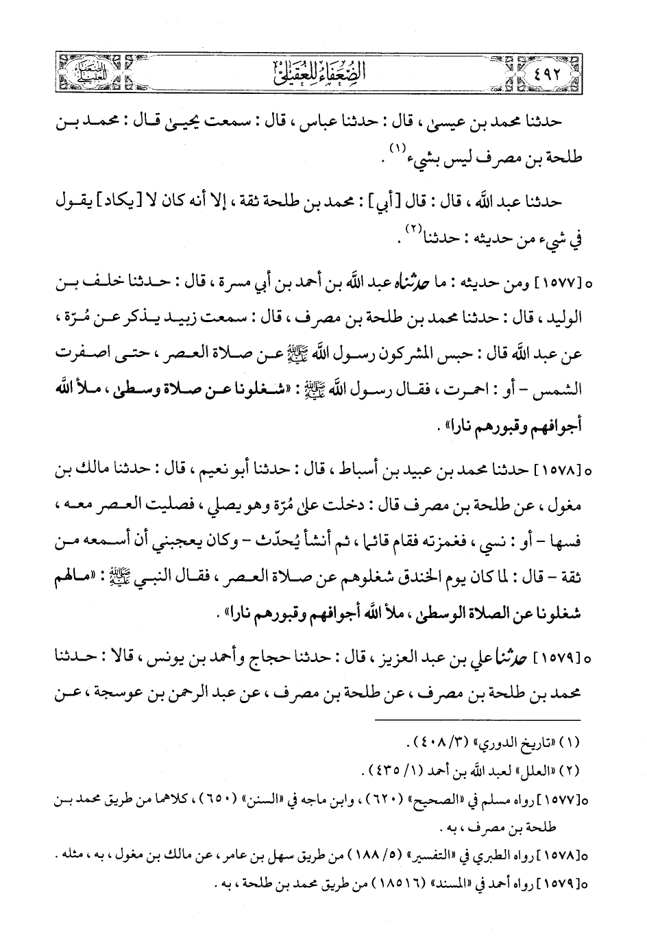 [1578] (4) حدثنا محمد بن عبيد بن أسباط، قال: حدثنا أبو نعيم، قال: حدثنا مالك بن مغول، عن طلحة بن مصرف قال: دخلت على مُرّة وهو يصلي، فصليت العصر معه، فسها - أو: نسي، فغمزته فقام قائما، ثم أنشأ يُحدّث - وكان يعجبني أن أسمعه من ثقة - قال: لما كان يوم الخندق شغلوهم عن صلاة العصر، فقال النبي صلى الله عليه وسلمع: «مالهم شغلونا عن الصلاة الوسطى، ملأ الله أجوافهم وقبورهم نارا».