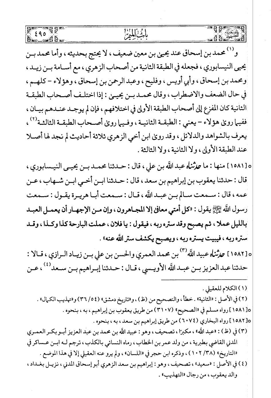 [1581] (3) منها: ما حدثناه عبد الله بن علي، قال: حدثنا محمد بن يحيى النيسابوري، قال: حدثنا يعقوب بن إبراهيم بن سعد، قال: حدثنا ابن أخي ابن شهاب، عن عمه، قال: سمعت سالم بن عبد الله، قال: سمعت أبا هريرة يقول: سمعت رسول الله صلى الله عليه وسلمع يقول: «كل أمتي معافى إلا المجاهرون، وإن من الإجهار أن يعمل العبد بالليل عملا، ثم يصبح وقد ستره ربه، فيقول: يا فلان، عملت البارحة كذا وكذا، وقد ستره ربه، فيبيت يستره ربه، ويصبح يكشف ستر الله عنه».