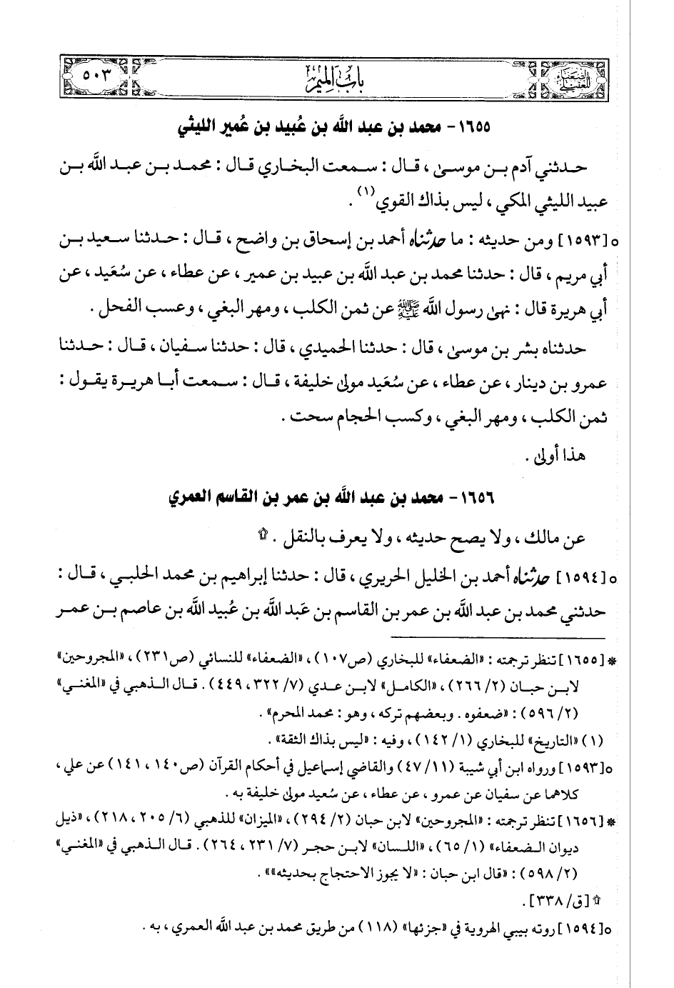 (1) * [1655] تنظر ترجمته: «الضعفاء» للبخاري (ص107) , «الضعفاء» للنسائي (ص231) , «المجروحين» لابن حبان (2/ 266) , «الكامل» لابن عدي (7/ 322، 449). قال الذهبي في «المغني» (2/ 596): «ضعفوه. وبعضهم تركه، وهو: محمد المحرم».
