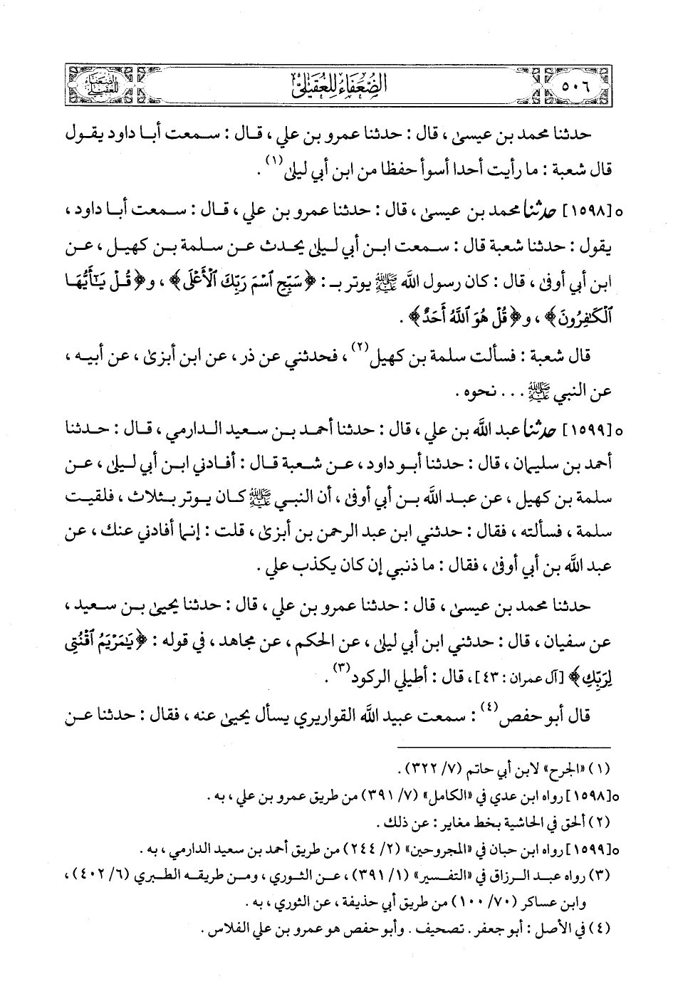 [1599] (4) حدثنا عبد الله بن علي، قال: حدثنا أحمد بن سعيد الدارمي، قال: حدثنا أحمد بن سليمان، قال: حدثنا أبو داود، عن شعبة قال: أفادني ابن أبي ليلى، عن سلمة بن كهيل، عن عبد الله بن أبي أوفى، أن النبي صلى الله عليه وسلمع كان يوتر بثلاث، فلقيت سلمة، فسألته، فقال: حدثني ابن عبد الرحمن بن أبزى، قلت: إنما أفادني عنك، عن عبد الله بن أبي أوفى، فقال: ما ذنبي إن كان يكذب علي.