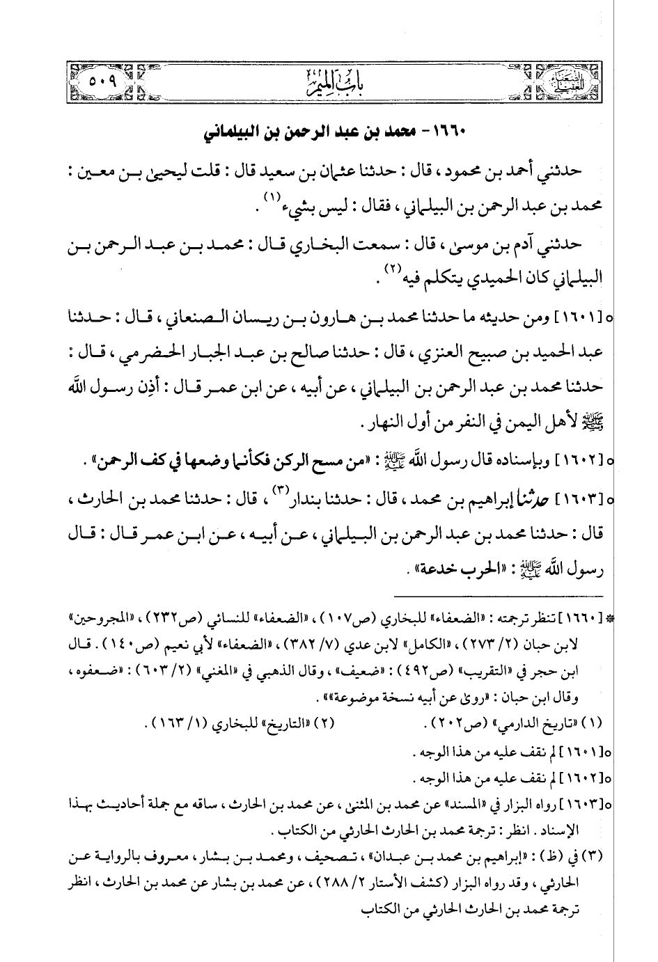 [1603] (6) حدثنا إبراهيم بن محمد، قال: حدثنا بندار (7)، قال: حدثنا محمد بن الحارث، قال: حدثنا محمد بن عبد الرحمن بن البيلماني، عن أبيه، عن ابن عمر قال: قال رسول الله صلى الله عليه وسلمع: «الحرب خدعة».