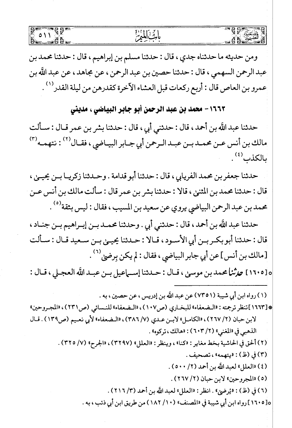 حدثنا عبد الله بن أحمد، قال: حدثني أبي، قال: حدثنا بشر بن عمر قال: سألت مالك بن أنس عن محمد بن عبد الرحمن أبي جابر البياضي، فقال (3): نتهمه (4) بالكذب (5).