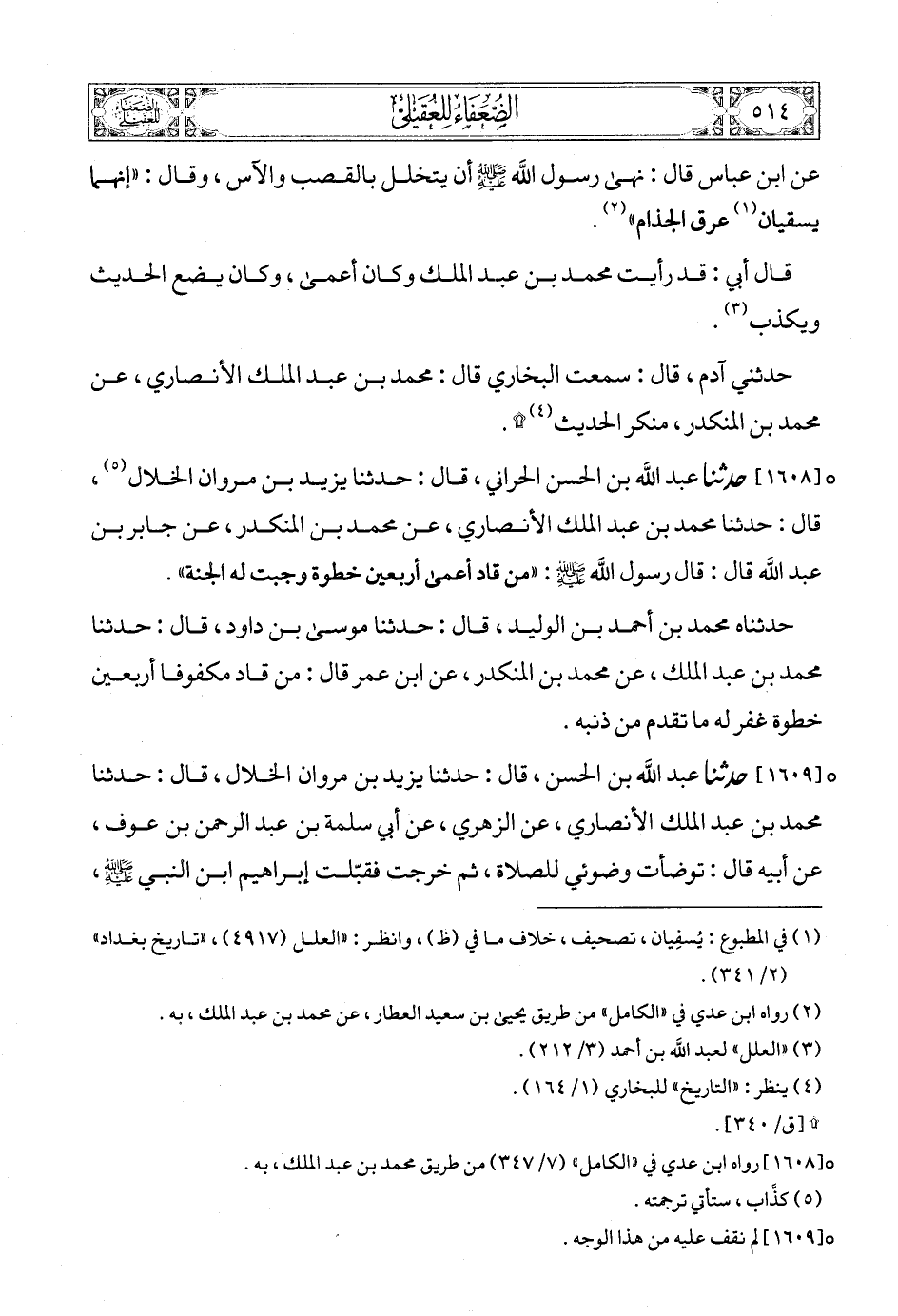 [1608] (6) حدثنا عبد الله بن الحسن الحراني، قال: حدثنا يزيد بن مروان الخلال (7)، قال: حدثنا محمد بن عبد الملك الأنصاري، عن محمد بن المنكدر، عن جابر بن عبد الله قال: قال رسول الله صلى الله عليه وسلمع: «من قاد أعمى أربعين خطوة وجبت له الجنة».