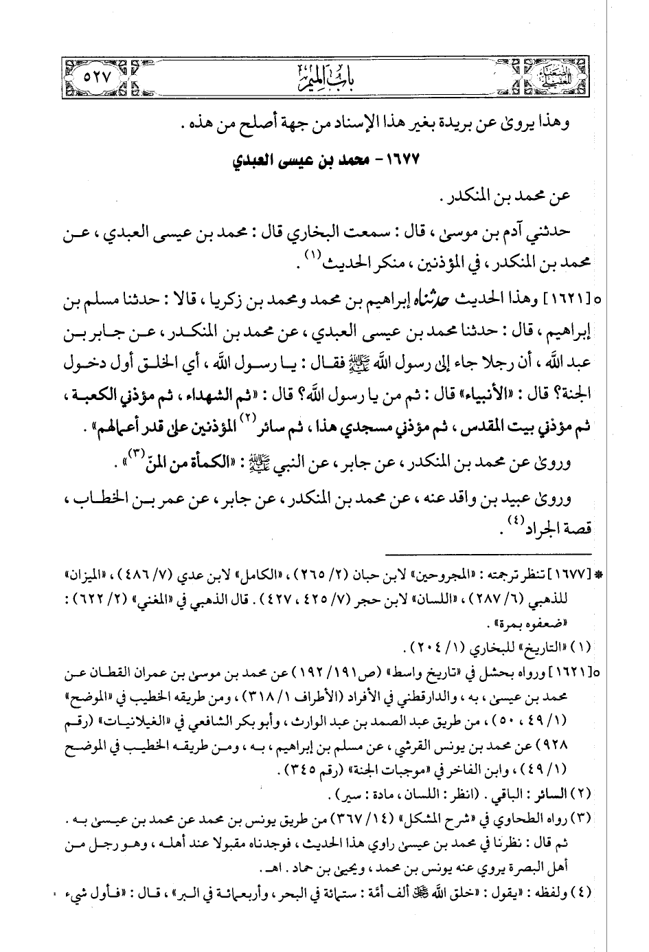 حدثني آدم بن موسى، قال: سمعت البخاري قال: محمد بن عيسى العبدي، عن محمد بن المنكدر، في المؤذنين، منكر الحديث (2).
