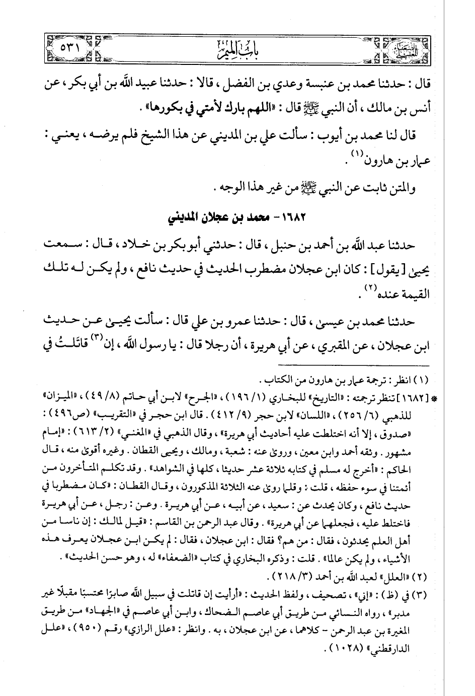 (2) * [1682] تنظر ترجمته: «التاريخ» للبخاري (1/ 196)، «الجرح» لابن أبي حاتم (8/ 49)، «الميزان» للذهبي (6/ 256) , «اللسان» لابن حجر (9/ 412). قال ابن حجر في «التقريب» (ص496): «صدوق، إلا أنه اختلطت عليه أحاديث أبي هريرة» , وقال الذهبي في «المغني» (2/ 613): «إمام مشهور. وثقه أحمد وابن معين، وروى عنه: شعبة، ومالك، ويحيى القطان. وغيره أقوى منه، قال الحاكم: «أخرج له مسلم في كتابه ثلاثة عشر حديثا، كلها في الشواهد». وقد تكلم المتأخرون من أئمتنا في سوء حفظه، قلت: وقلما روى عنه الثلاثة المذكورون، وقال القطان: «كان مضطربا في حديث نافع، وكان يحدث عن: سعيد، عن أبيه، عن أبي هريرة. وعن: رجل، عن أبي هريرة فاختلط عليه، فجعلهما عن أبي هريرة». وقال عبد الرحمن بن القاسم: «قيل لمالك: إن ناسا من أهل العلم يحدثون، فقال: من هم؟ فقال: ابن عجلان، فقال: لم يكن ابن عجلان يعرف هذه الأشياء، ولم يكن عالما». قلت: وذكره البخاري في كتاب «الضعفاء» له، وهو حسن الحديث».