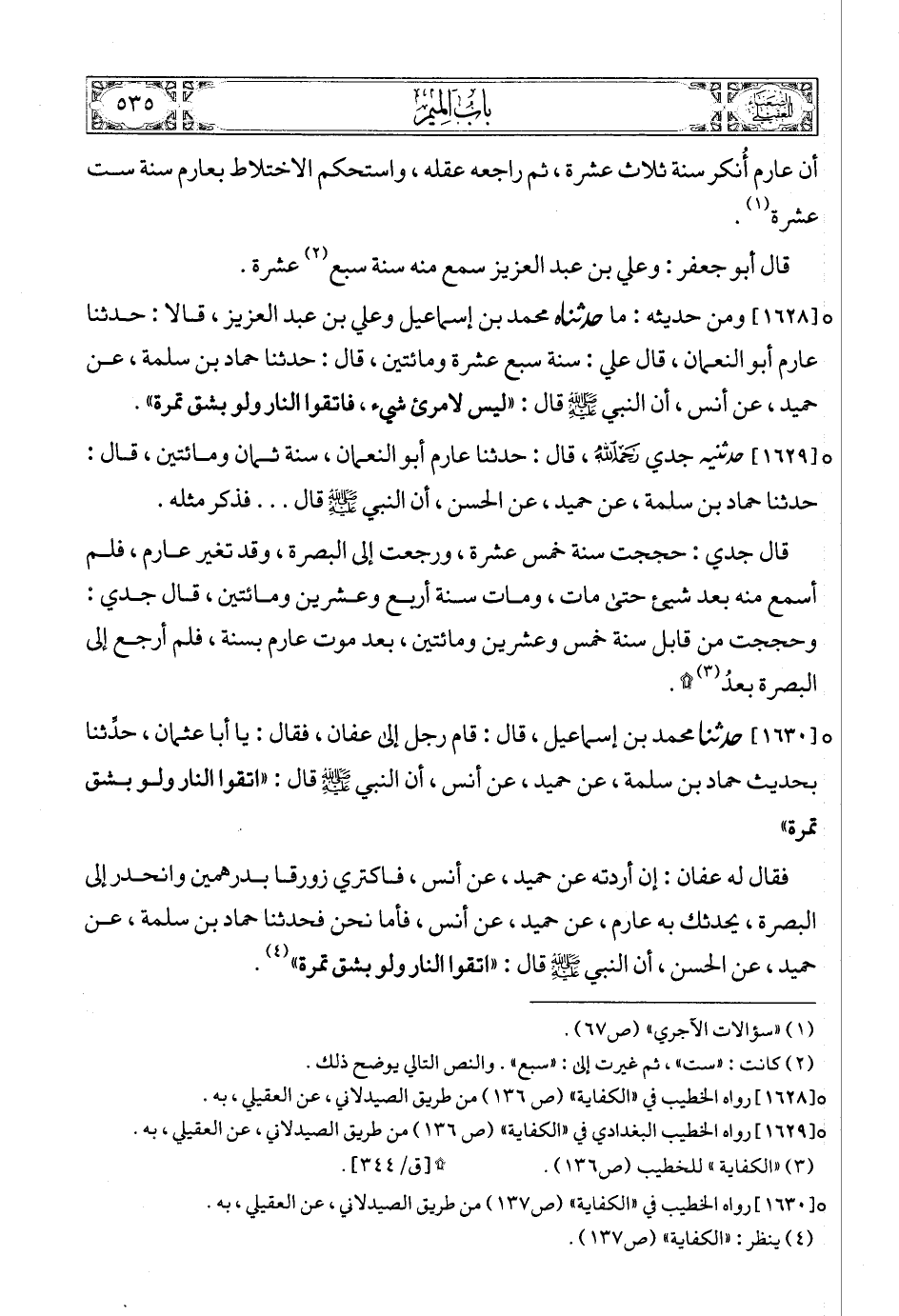 فقال له عفان: إن أردته عن حميد، عن أنس، فاكتري زورقا بدرهمين وانحدر إلى البصرة، يحدثك به عارم، عن حميد، عن أنس، فأما نحن فحدثنا حماد بن سلمة، عن حميد، عن الحسن، أن النبي صلى الله عليه وسلمع قال: «اتقوا النار ولو بشق تمرة» (8).
