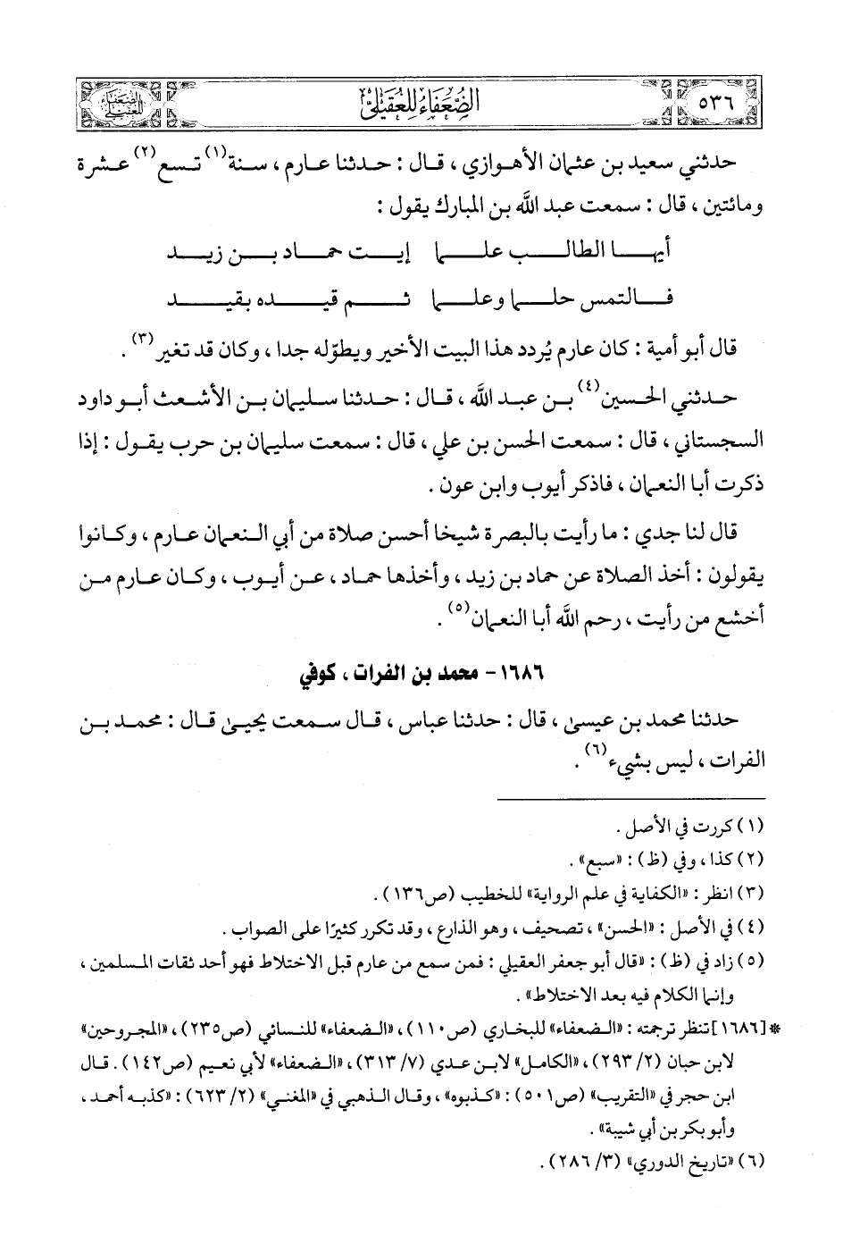 (6) * [1686] تنظر ترجمته: «الضعفاء» للبخاري (ص110) , «الضعفاء» للنسائي (ص235) , «المجروحين» لابن حبان (2/ 293) , «الكامل» لابن عدي (7/ 313) , «الضعفاء» لأبي نعيم (ص142). قال ابن حجر في «التقريب» (ص501): «كذبوه» , وقال الذهبي في «المغني» (2/ 623): «كذبه أحمد، وأبو بكر بن أبي شيبة».