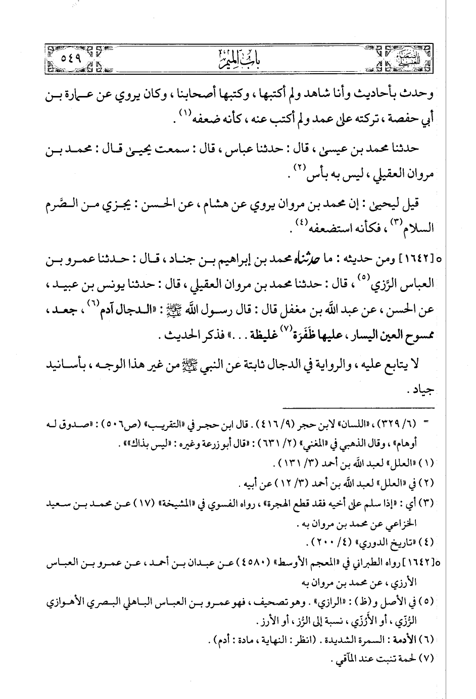 [1642] (5) ومن حديثه: ما حدثناه محمد بن إبراهيم بن جناد، قال: حدثنا عمرو بن العباس الرَّزي (6)، قال: حدثنا محمد بن مروان العقيلي، قال: حدثنا يونس بن عبيد، عن الحسن، عن عبد الله بن مغفل قال: قال رسول الله صلى الله عليه وسلمع: «الدجال آدم (7)، جعد، ممسوح العين اليسار، عليها ظَفَرَة (8) غليظة ... » فذكر الحديث.