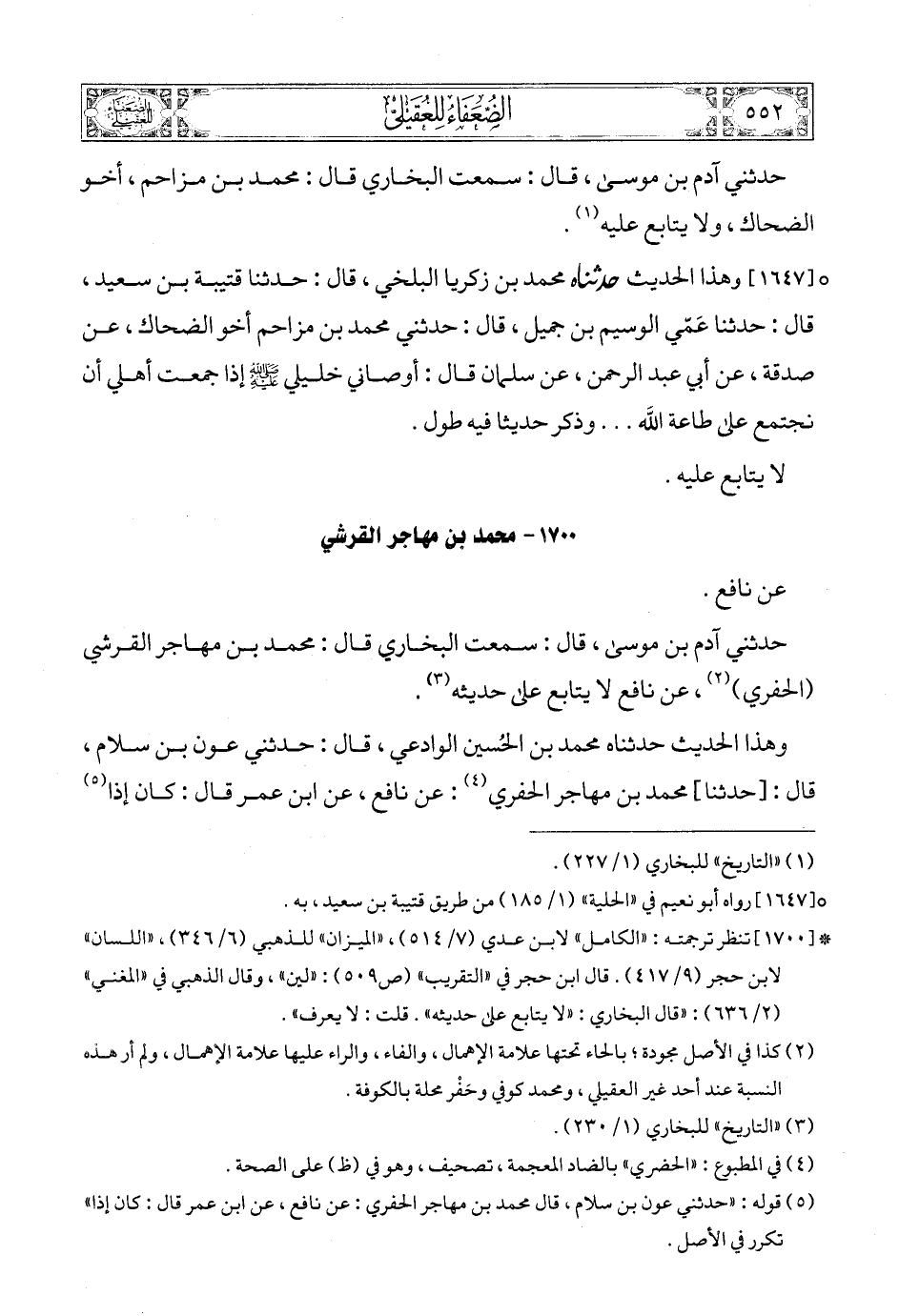 حدثني آدم بن موسى، قال: سمعت البخاري قال: محمد بن مهاجر القرشي (الحفري) (4)، عن نافع لا يتابع على حديثه (5).