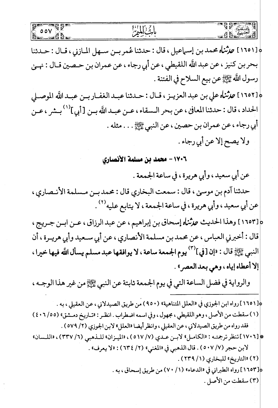 حدثنا آدم بن موسى، قال: سمعت البخاري قال: محمد بن مسلمة الأنصاري، عن أبي سعيد، وأبي هريرة، في ساعة الجمعة، لا يتابع عليه (4).