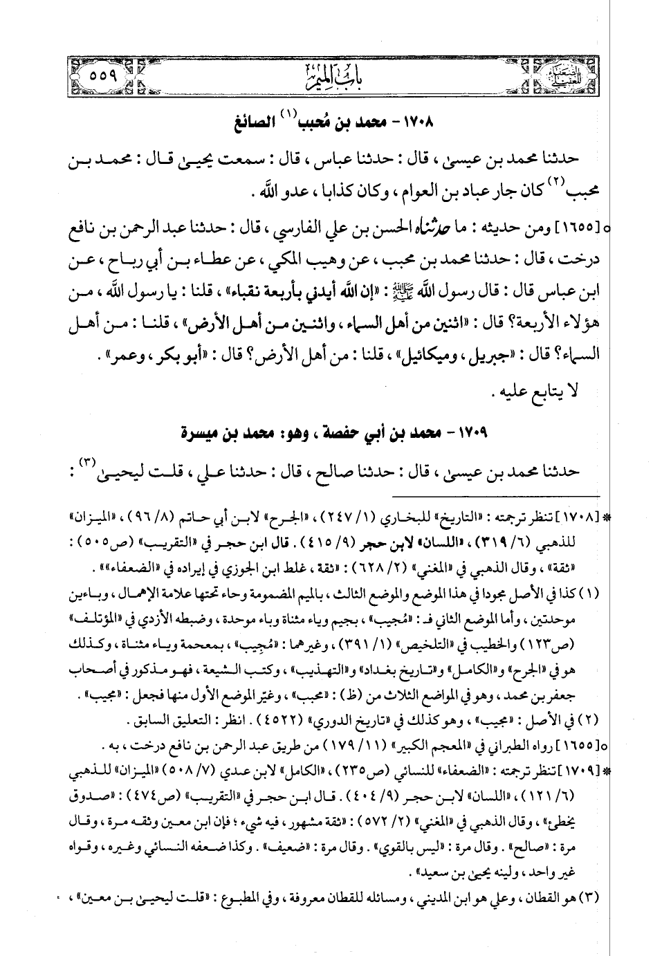 (2) كذا في الأصل مجودا في هذا الموضع والموضع الثالث، بالميم المضمومة وحاء تحتها علامة الإهمال، وباءين موحدتين، وأما الموضع الثاني فـ: «مُجيب»، بجيم وياء مثناة وباء موحدة، وضبطه الأزدي في «المؤتلف» (ص123) والخطيب في «التلخيص» (1/ 391)، وغيرهما: «مُجِيب»، بمعحمة وياء مثناة، وكذلك هو في «الجرح» و «الكامل» و «تاريخ بغداد» و «التهذيب»، وكتب الشيعة، فهو مذكور في أصحاب جعفر بن محمد، وهو في المواضع الثلاث من (ظ): «محبب»، وغيّر الموضع الأول منها فجعل: «مجيب».
