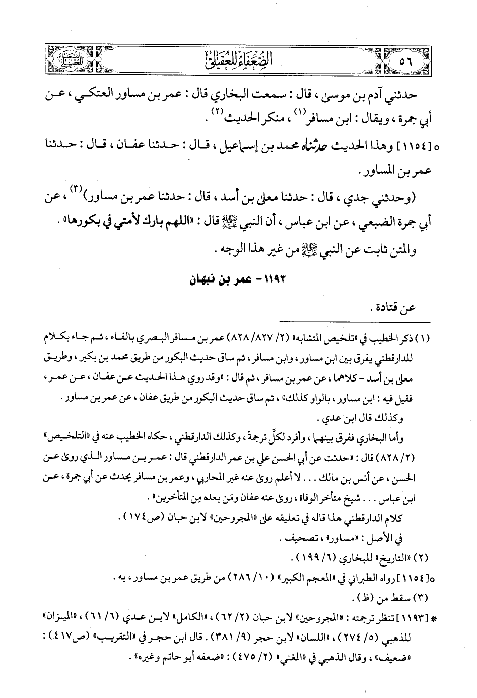 حدثني آدم بن موسى، قال: سمعت البخاري قال: عمر بن مساور العتكي، عن أبي جمرة، ويقال: ابن مسافر (1)، منكر الحديث (2).