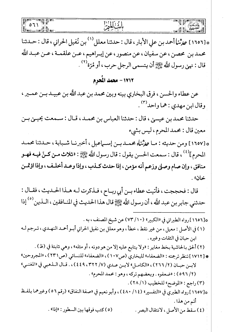 (4) * [1712] تنظر ترجمته: «الضعفاء» للبخاري (ص107) , «الضعفاء» للنسائي (ص231) , «المجروحين» لابن حبان (2/ 266) , «الكامل» لابن عدي (7/ 322، 449) ,. قال الذهبي في «المغني» (2/ 596): «ضعفوه. وبعضهم تركه، وهو: محمد المحرم».