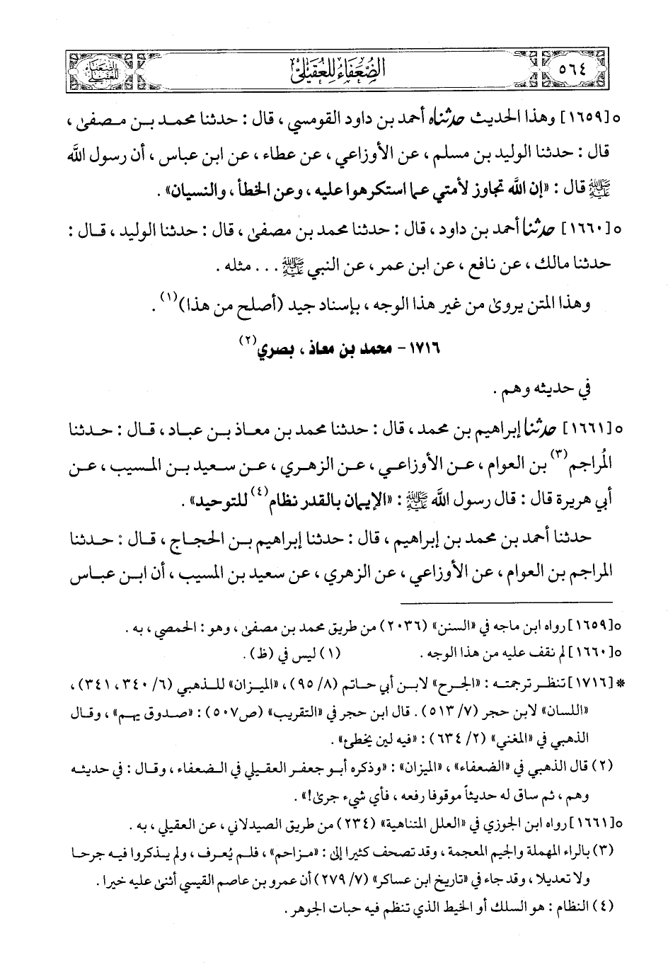 (6) [1661] رواه ابن الجوزي في «العلل المتناهية» (234) من طريق الصيدلاني، عن العقيلي، به.