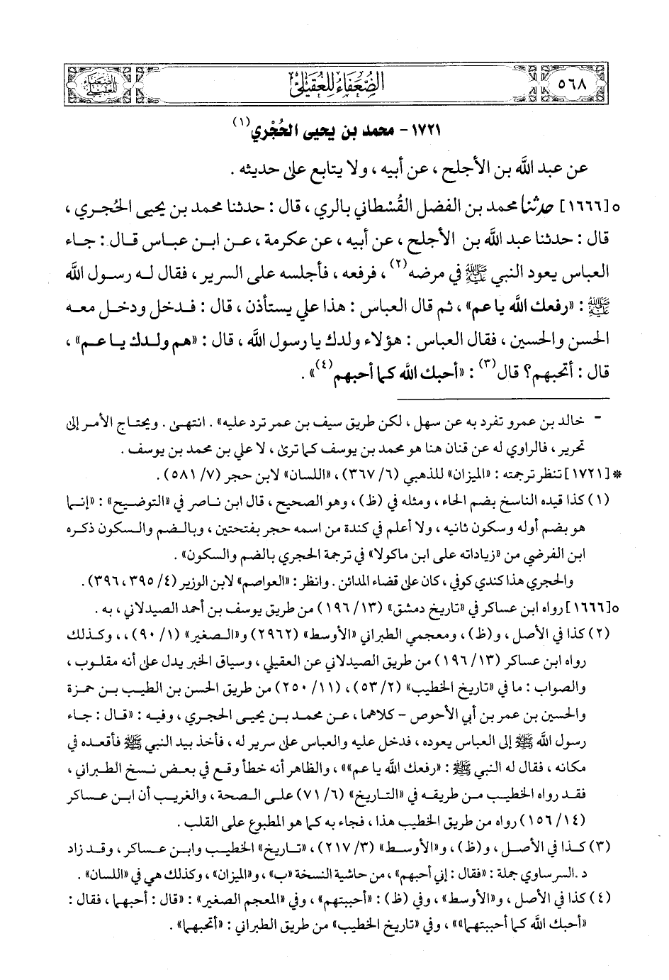 [1666] (3) حدثنا محمد بن الفضل القُسْطاني بالري، قال: حدثنا محمد بن يحيى الحُجري، قال: حدثنا عبد الله بن الأجلح، عن أبيه، عن عكرمة، عن ابن عباس قال: جاء العباس يعود النبي صلى الله عليه وسلمع في مرضه (4)، فرفعه، فأجلسه على السرير، فقال له رسول الله صلى الله عليه وسلمع: «رفعك الله يا عم»، ثم قال العباس: هذا علي يستأذن، قال: فدخل ودخل معه الحسن والحسين، فقال العباس: هؤلاء ولدك يا رسول الله، قال: «هم ولدك يا عم»، قال: أتحبهم؟ قال (5): «أحبك الله كما أحبهم (6)».