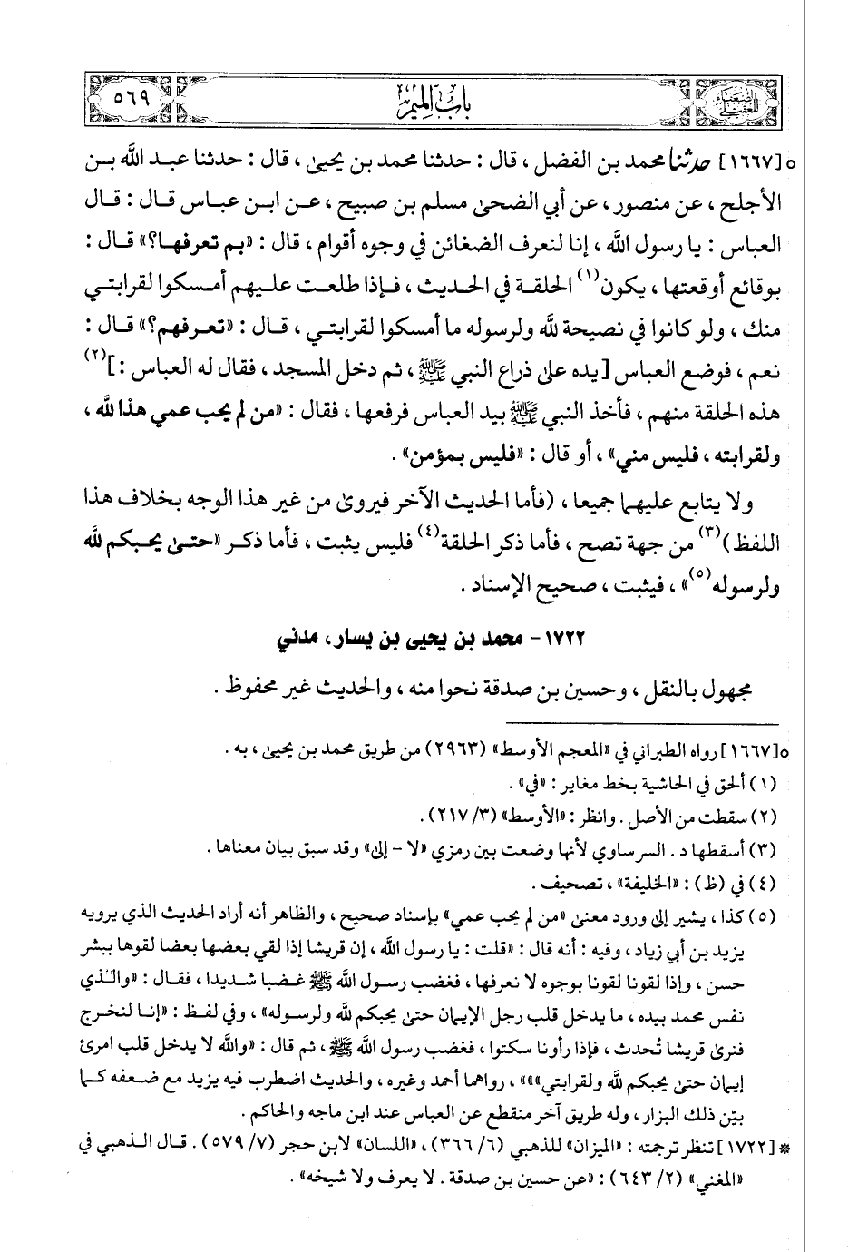 (6) كذا، يشير إلى ورود معنى «من لم يحب عمي» بإسناد صحيح، والظاهر أنه أراد الحديث الذي يرويه يزيد بن أبي زياد، وفيه: أنه قال: «قلت: يا رسول الله، إن قريشا إذا لقي بعضها بعضا لقوها ببشر حسن، وإذا لقونا لقونا بوجوه لا نعرفها، فغضب رسول الله صص غضبا شديدا، فقال: «والذي نفس محمد بيده، ما يدخل قلب رجل الإيمان حتى يحبكم لله ولرسوله»، وفي لفظ: «إنا لنخرج فنرى قريشا تُحدث، فإذا رأونا سكتوا، فغضب رسول الله صص، ثم قال: «والله لا يدخل قلب امرئ إيمان حتى يحبكم لله ولقرابتي»»»، رواهما أحمد وغيره، والحديث اضطرب فيه يزيد مع ضعفه كما بيّن ذلك البزار، وله طريق آخر منقطع عن العباس عند ابن ماجه والحاكم.