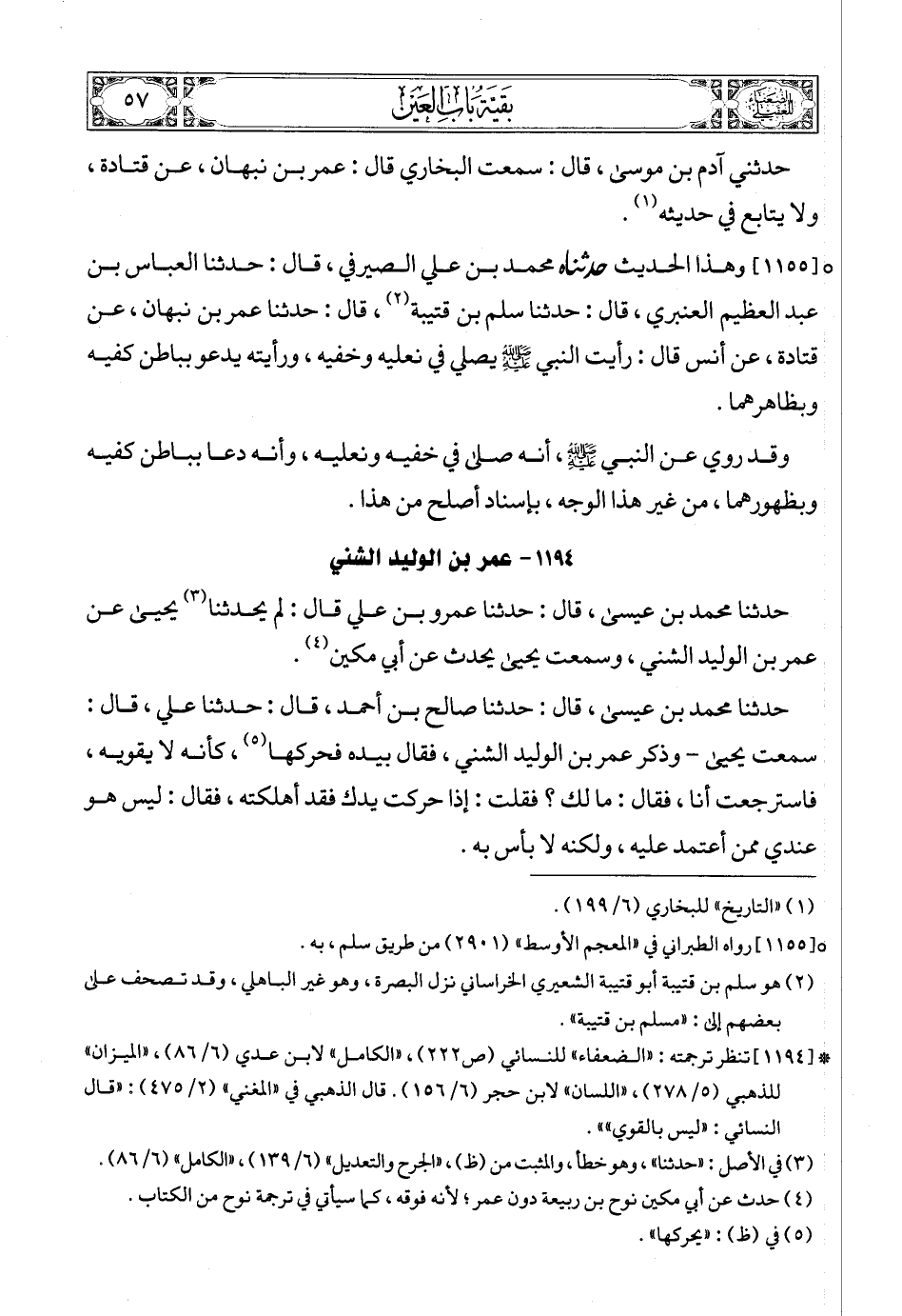 [1155] (2) وهذا الحديث حدثناه محمد بن علي الصيرفي، قال: حدثنا العباس بن عبد العظيم العنبري، قال: حدثنا سلم بن قتيبة (3)، قال: حدثنا عمر بن نبهان، عن قتادة، عن أنس قال: رأيت النبي صلى الله عليه وسلمع يصلي في نعليه وخفيه، ورأيته يدعو بباطن كفيه وبظاهرهما.