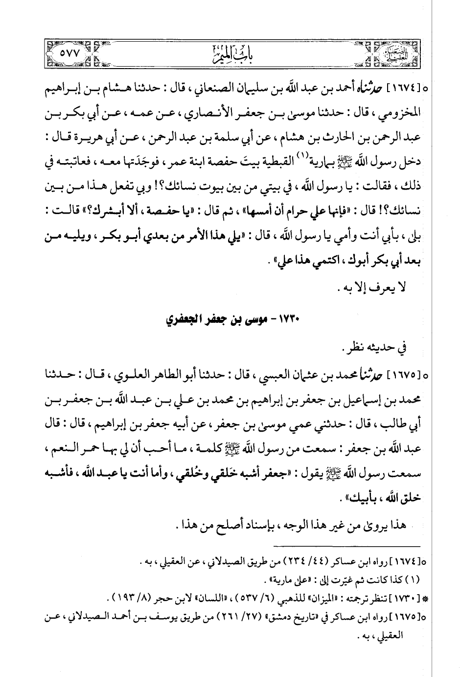 [1674] (1) حدثناه أحمد بن عبد الله بن سليمان الصنعاني، قال: حدثنا هشام بن إبراهيم المخزومي، قال: حدثنا موسى بن جعفر الأنصاري، عن عمه، عن أبي بكر بن عبد الرحمن بن الحارث بن هشام، عن أبي سلمة بن عبد الرحمن، عن أبي هريرة قال: دخل رسول الله صلى الله عليه وسلمع بمارية (2) القبطية بيتَ حفصة ابنة عمر، فوجَدَتها معه، فعاتبته في ذلك، فقالت: يا رسول الله، في بيتي من بين بيوت نسائك؟! وبي تفعل هذا من بين نسائك؟! قال: «فإنها علي حرام أن أمسها»، ثم قال: «يا حفصة، ألا أبشرك؟» قالت: بلى، بأبي أنت وأمي يا رسول الله، قال: «يلي هذا الأمر من بعدي أبو بكر، ويليه من بعد أبي بكر أبوك، اكتمي هذا علي».