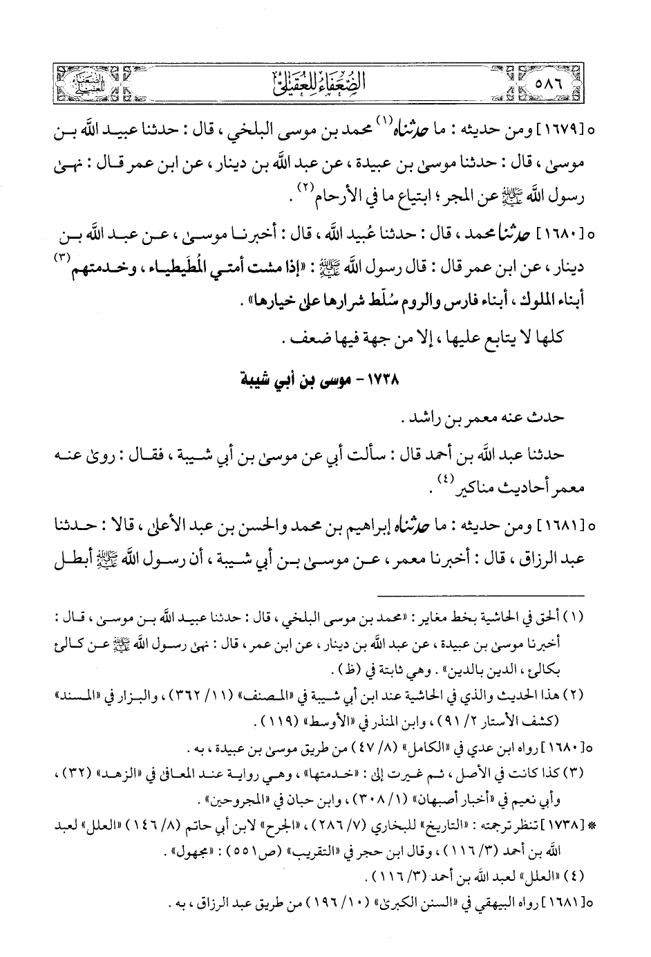 (5) * [1738] تنظر ترجمته: «التاريخ» للبخاري (7/ 286)، «الجرح» لابن أبي حاتم (8/ 146) «العلل» لعبد الله بن أحمد (3/ 116)، وقال ابن حجر في «التقريب» (ص551): «مجهول».