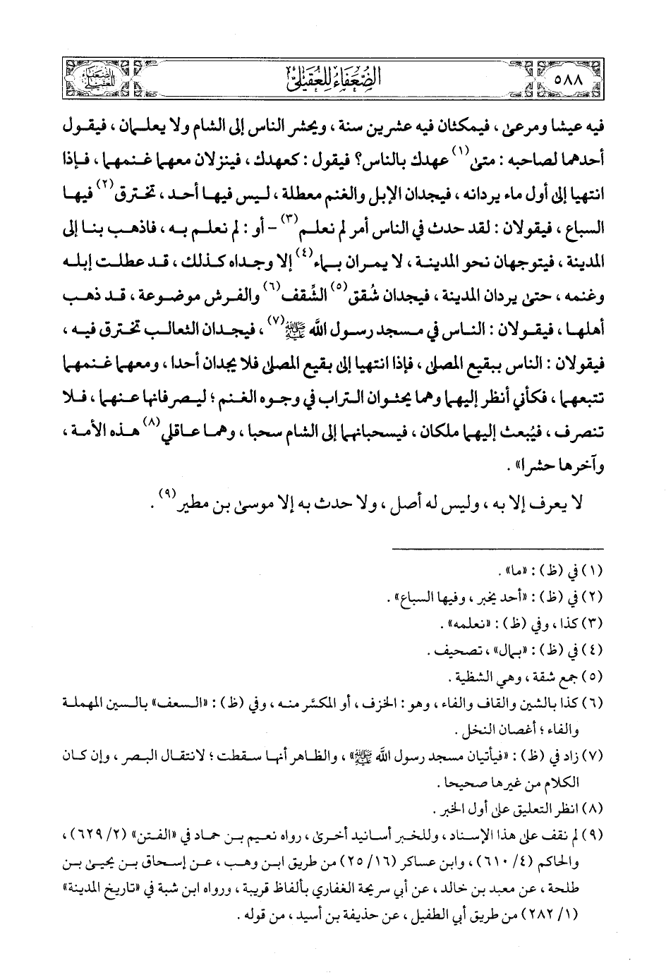 (9) لم نقف على هذا الإسناد، وللخبر أسانيد أخرى، رواه نعيم بن حماد في «الفتن» (2/ 629)، والحاكم (4/ 610)، وابن عساكر (16/ 25) من طريق ابن وهب، عن إسحاق بن يحيى بن طلحة، عن معبد بن خالد، عن أبي سريحة الغفاري بألفاظ قريبة، ورواه ابن شبة في «تاريخ المدينة» (1/ 282) من طريق أبي الطفيل، عن حذيفة بن أسيد، من قوله.