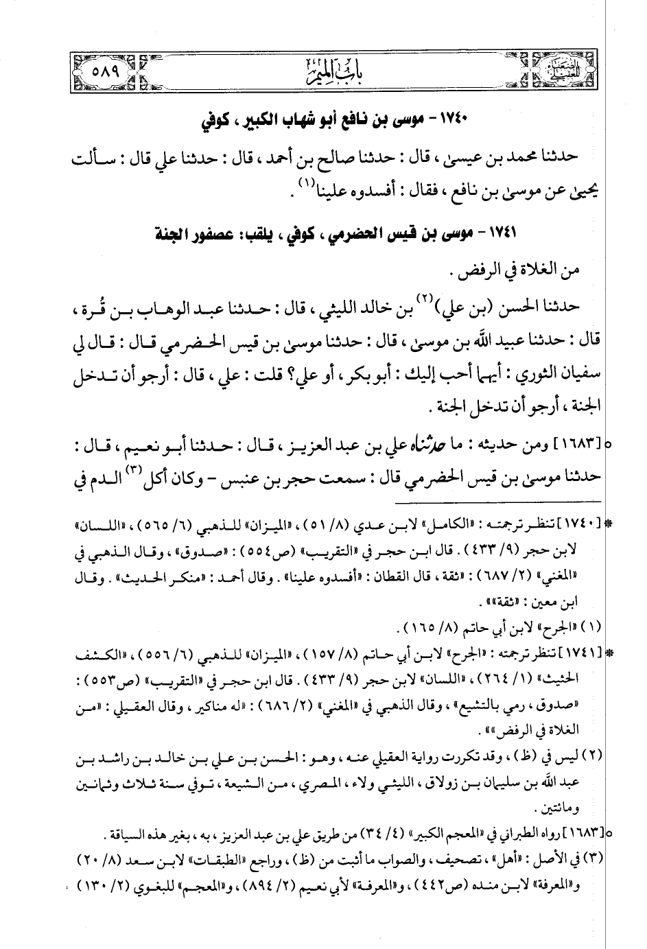 (3) * [1741] تنظر ترجمته: «الجرح» لابن أبي حاتم (8/ 157)، «الميزان» للذهبي (6/ 556) , «الكشف الحثيث» (1/ 264)، «اللسان» لابن حجر (9/ 433). قال ابن حجر في «التقريب» (ص553): «صدوق، رمي بالتشيع» , وقال الذهبي في «المغني» (2/ 686): «له مناكير، وقال العقيلي: «من الغلاة في الرفض»».