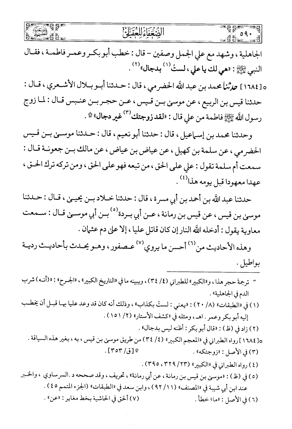 [1684] (3) حدثنا محمد بن عبد الله الحضرمي، قال: حدثنا أبو بلال الأشعري، قال: حدثنا قيس بن الربيع، عن موسى بن قيس، عن حجر بن عنبس قال: لما زوج رسول الله صلى الله عليه وسلمع فاطمة من علي قال: «لقد زوجتك (4) غير دجال» (5) ?.