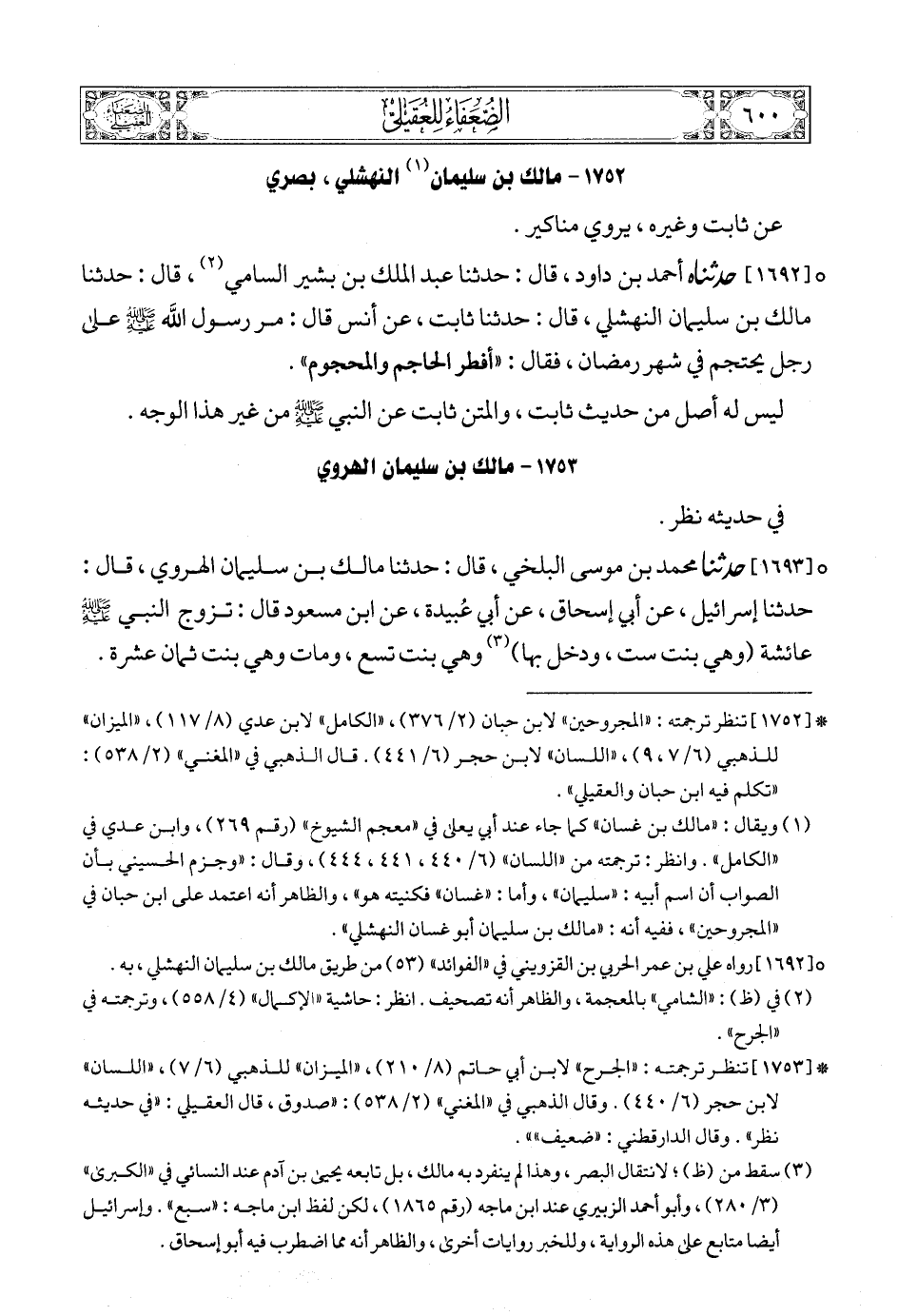 (1) * [1752] تنظر ترجمته: «المجروحين» لابن حبان (2/ 376) , «الكامل» لابن عدي (8/ 117) , «الميزان» للذهبي (6/ 7، 9) , «اللسان» لابن حجر (6/ 441). قال الذهبي في «المغني» (2/ 538): «تكلم فيه ابن حبان والعقيلي».
