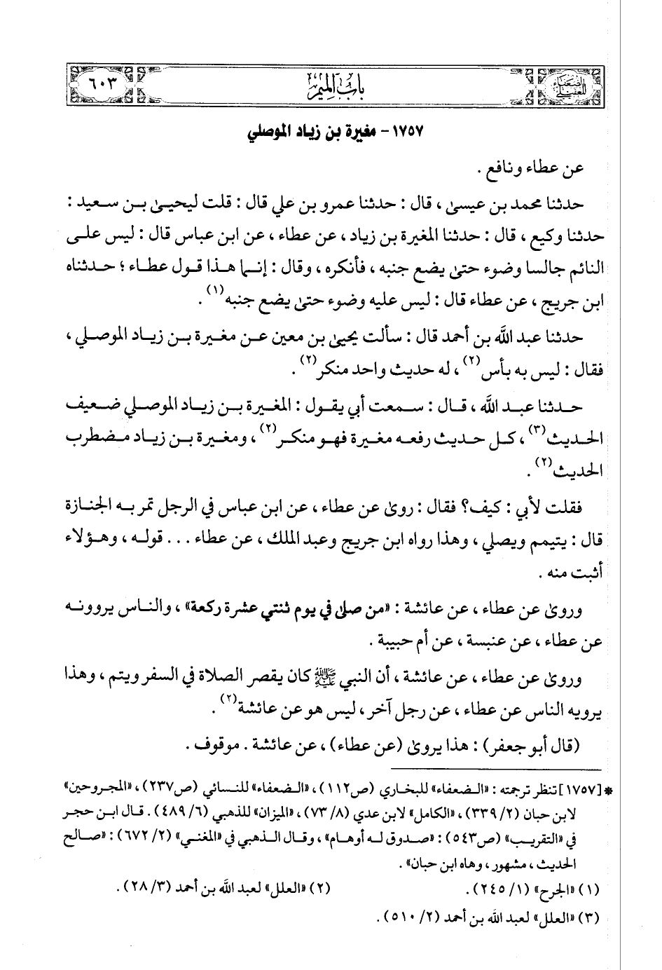 حدثنا عبد الله، قال: سمعت أبي يقول: المغيرة بن زياد الموصلي ضعيف الحديث (4)، كل حديث رفعه مغيرة فهو منكر (2)، ومغيرة بن زياد مضطرب الحديث (2).