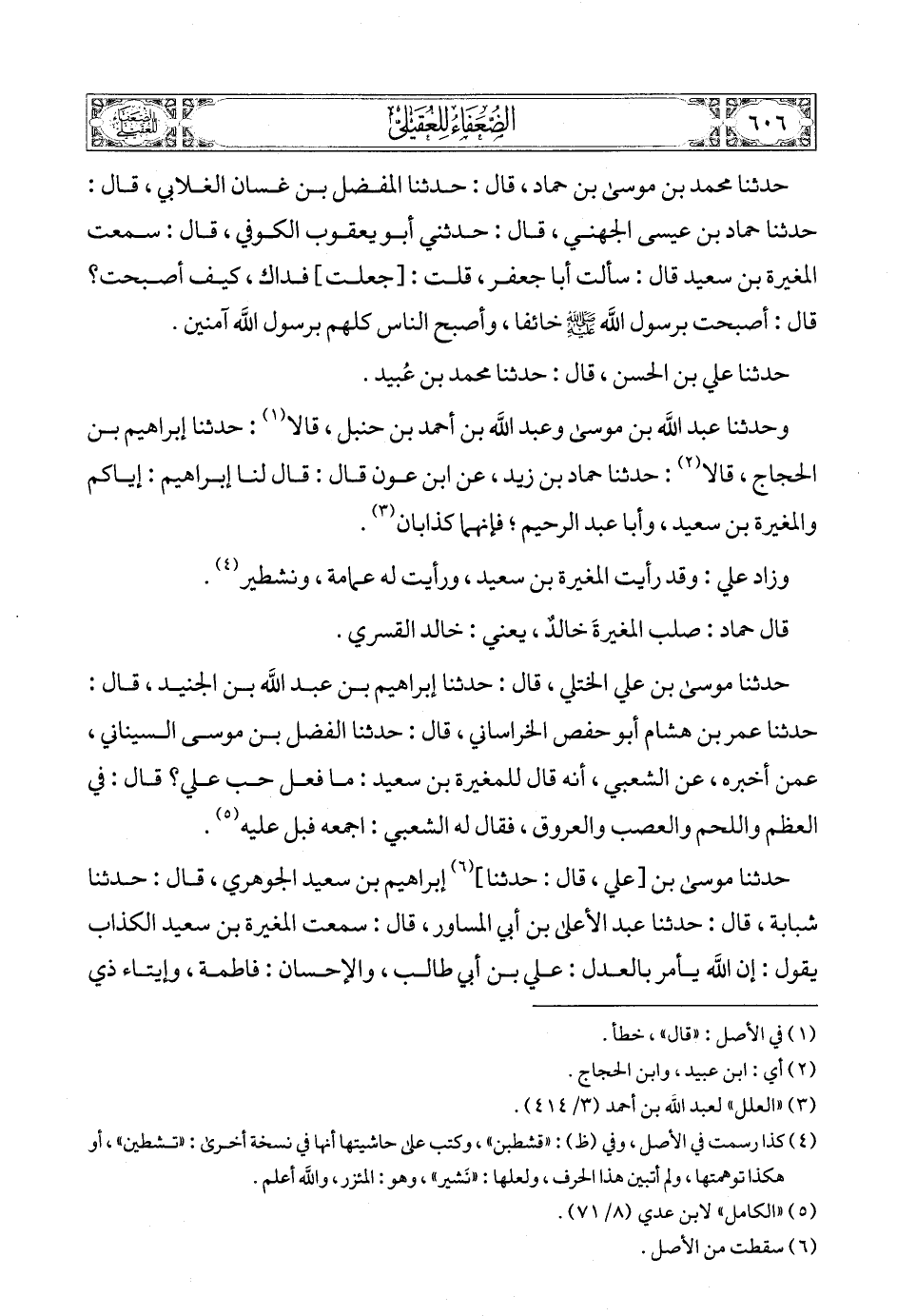 حدثنا موسى بن علي الختلي، قال: حدثنا إبراهيم بن عبد الله بن الجنيد، قال: حدثنا عمر بن هشام أبو حفص الخراساني، قال: حدثنا الفضل بن موسى السيناني، عمن أخبره، عن الشعبي، أنه قال للمغيرة بن سعيد: ما فعل حب علي؟ قال: في العظم واللحم والعصب والعروق، فقال له الشعبي: اجمعه فبل عليه (5).