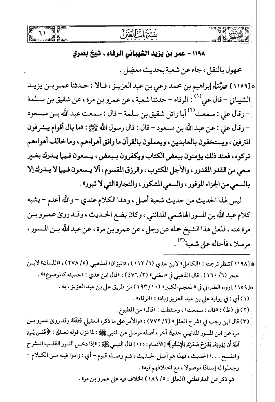 [1159] (2) حدثناه إبراهيم بن محمد وعلي بن عبد العزيز، قالا: حدثنا عمر بن يزيد الشيباني - قال علي (3): الرفاء - حدثنا شعبة، عن عمرو بن مرة، عن شقيق بن سلمة - وقال علي: سمعت (4) أبا وائل شقيق بن سلمة - قال: سمعت عبد الله بن مسعود - وقال علي: عن عبد الله بن مسعود - قال: قال رسول الله صلى الله عليه وسلمع: «ما بال أقوام يشرفون المترفين، ويستخفون بالعابدين، ويعملون بالقرآن ما وافق أهواءهم، وما خالف أهواءهم تركوه، فعند ذلك يؤمنون ببعض الكتاب ويكفرون ببعض، يسعون فيما يدرك بغير سعي من القدر المقدور، والأجل المكتوب، والرزق المقسوم، ألا يسعون فيما لا يدرك إلا بالسعي من الجزاء الموفور، والسعي المشكور، والتجارة التي لا تبور».