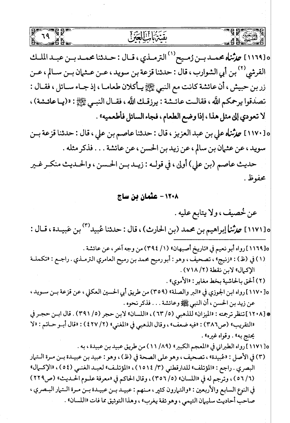 [1169] (1) حدثناه محمد بن رُميح (2) الترمذي، قال: حدثنا محمد بن عبد الملك القرشي (3) بن أبي الشوارب، قال: حدثنا قزعة بن سويد، عن عثمان بن سالم، عن زر بن حبيش، أن عائشة كانت مع النبي صلى الله عليه وسلمع يأكلان طعاما، إذ جاء سائل، فقال: تصدقوا يرحمكم الله، فقالت عائشة: يرزقك الله، فقال النبي صلى الله عليه وسلمع: «(يا عائشة)، لا تعودي إلى مثل هذا، إذا وضع الطعام، فجاء السائل فأطعميه».