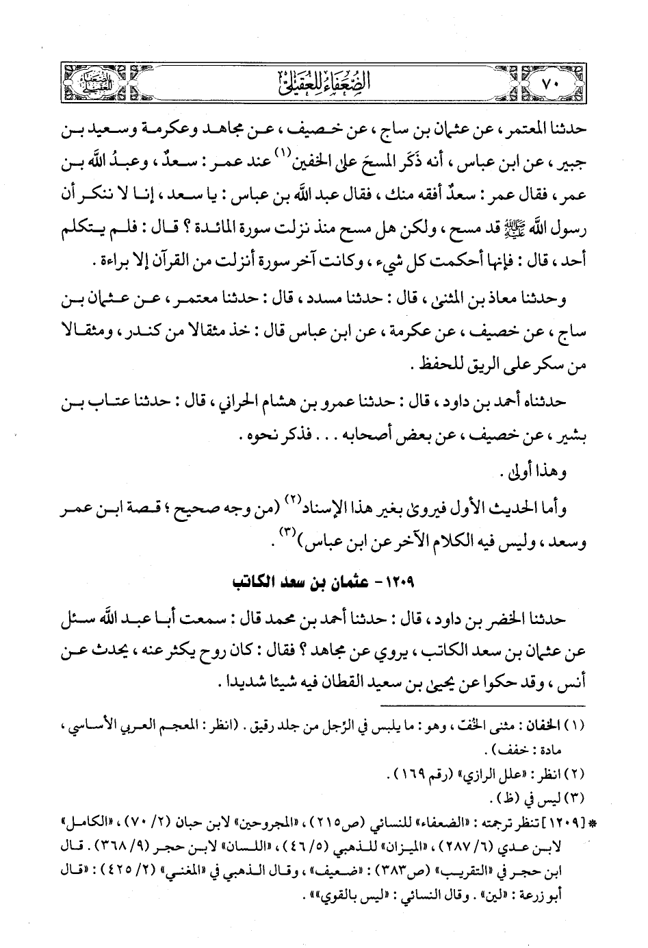 (4) * [1209] تنظر ترجمته: «الضعفاء» للنسائي (ص215) , «المجروحين» لابن حبان (2/ 70) , «الكامل» لابن عدي (6/ 287) , «الميزان» للذهبي (5/ 46) , «اللسان» لابن حجر (9/ 368). قال ابن حجر في «التقريب» (ص383): «ضعيف» , وقال الذهبي في «المغني» (2/ 425): «قال أبو زرعة: «لين». وقال النسائي: «ليس بالقوي»».