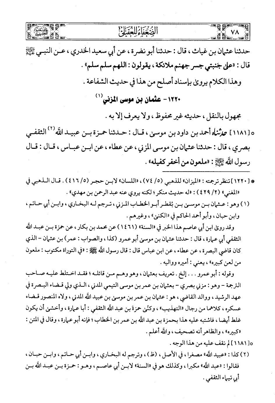 وقوله: أبو عمرو ... إلخ. تعريف بعثمان، وهو وهم من قائله؛ فقد اختلط عليه صاحب الترجمة - وهو: مزني بصري - بعثمان بن عمر بن موسى التيمي المدني، الذي ولي قضاء البصرة في عهد الرشيد، ووالد القاضي، هو: عثمان بن عمر بن موسى بن عبيد الله المدني، ولاه المنصور قضاء عسكره، كلاهما من رجال «التهذيب»، وكنّى حمزةَ بن عبد الله الثقفي: أبا عمارة، وأخشى أن يكون غلط أيضا، فاشتبه عليه هذا بحمزة بن عبد الله بن عمر بن الخطاب؛ فإنه أبو عمارة، وقال في المتن: «كبيره»، والظاهر أنه تصحيف، والله أعلم.