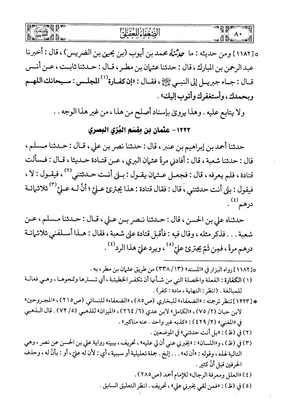 [1182] (1) ومن حديثه: ما حدثناه محمد بن أيوب (بن يحيى بن الضريس)، قال: أخبرنا عبد الرحمن بن المبارك، قال: حدثنا عثمان بن مطر، قال: حدثنا ثابت، عن أنس قال: جاء جبريل إلى النبي صلى الله عليه وسلمع، فقال: «إن كفارة (2) المجلس: سبحانك اللهم وبحمدك، وأستغفرك وأتوب إليك».