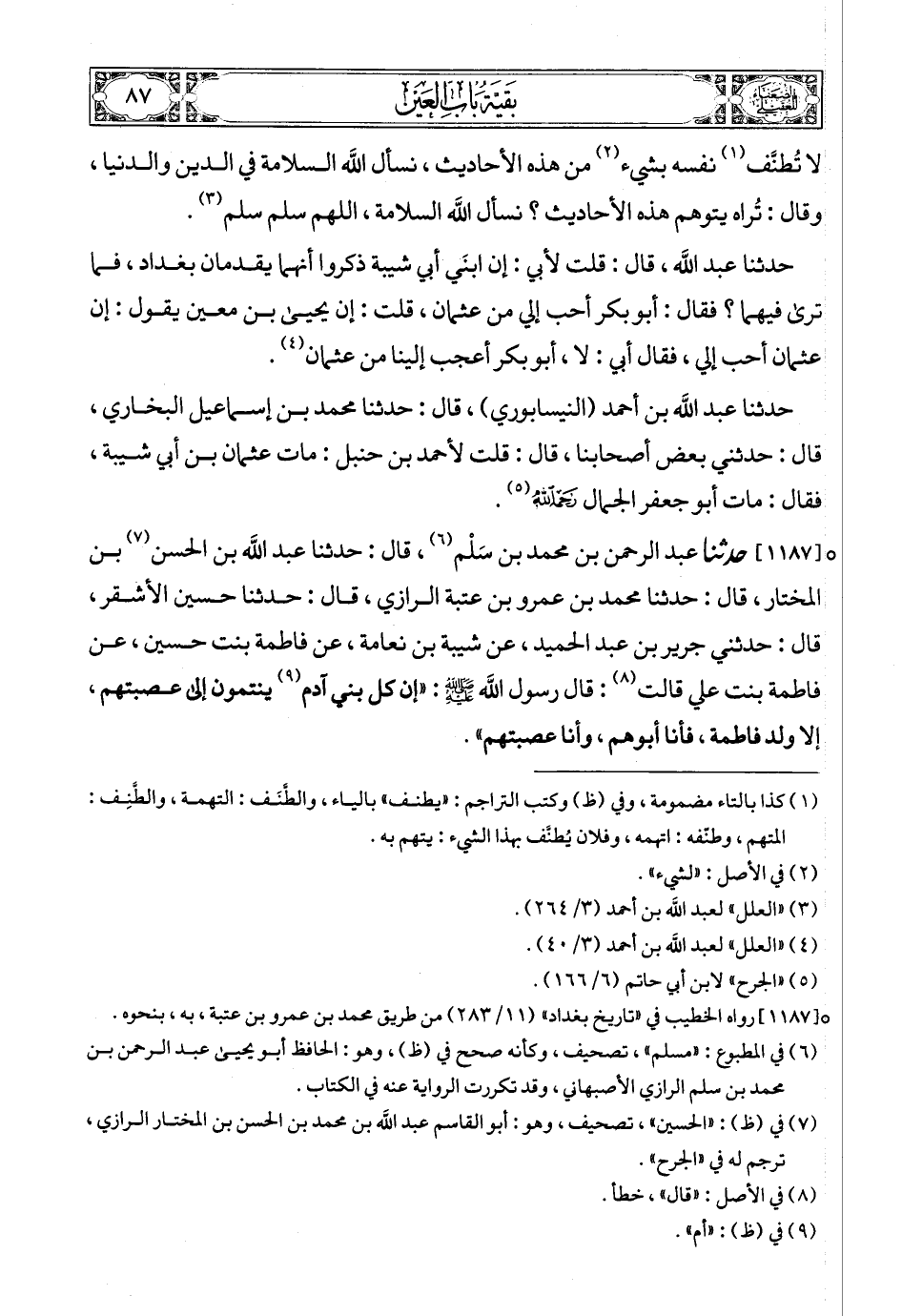 [1187] (6) حدثنا عبد الرحمن بن محمد بن سَلْم (7)، قال: حدثنا عبد الله بن الحسن (8) بن المختار، قال: حدثنا محمد بن عمرو بن عتبة الرازي، قال: حدثنا حسين الأشقر، قال: حدثني جرير بن عبد الحميد، عن شيبة بن نعامة، عن فاطمة بنت حسين، عن فاطمة بنت علي قالت (9): قال رسول الله صلى الله عليه وسلمع: «إن كل بني آدم (10) ينتمون إلى عصبتهم، إلا ولد فاطمة، فأنا أبوهم، وأنا عصبتهم».