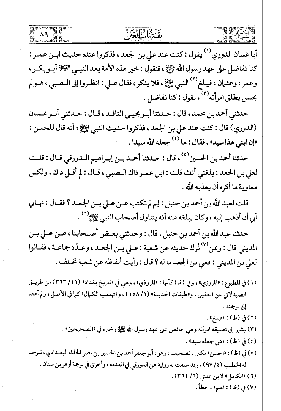 حدثني أحمد بن محمد، قال: حدثنا أبو يحيى الناقد، قال: حدثني أبو غسان (الدوري) قال: كنت عند علي بن الجعد، فذكروا حديث النبي صلى الله عليه وسلمع؛ أنه قال للحسن: «إن ابني هذا سيد»، فقال: ما (5) جعله الله سيدا.