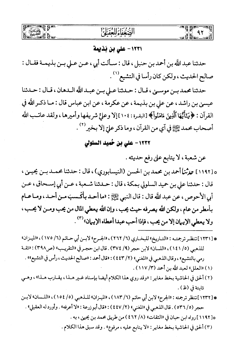 (2) * [1231] تنظر ترجمته: «التاريخ» للبخاري (6/ 262)، «الجرح» لابن أبي حاتم (6/ 175)، «الميزان» للذهبي (5/ 141) , «اللسان» لابن حجر (9/ 374). قال ابن حجر في «التقريب» (ص398): «ثقة رمي بالتشيع» , وقال الذهبي في «المغني» (2/ 443): «قال أحمد: «صالح الحديث، رأس في التشيع»».