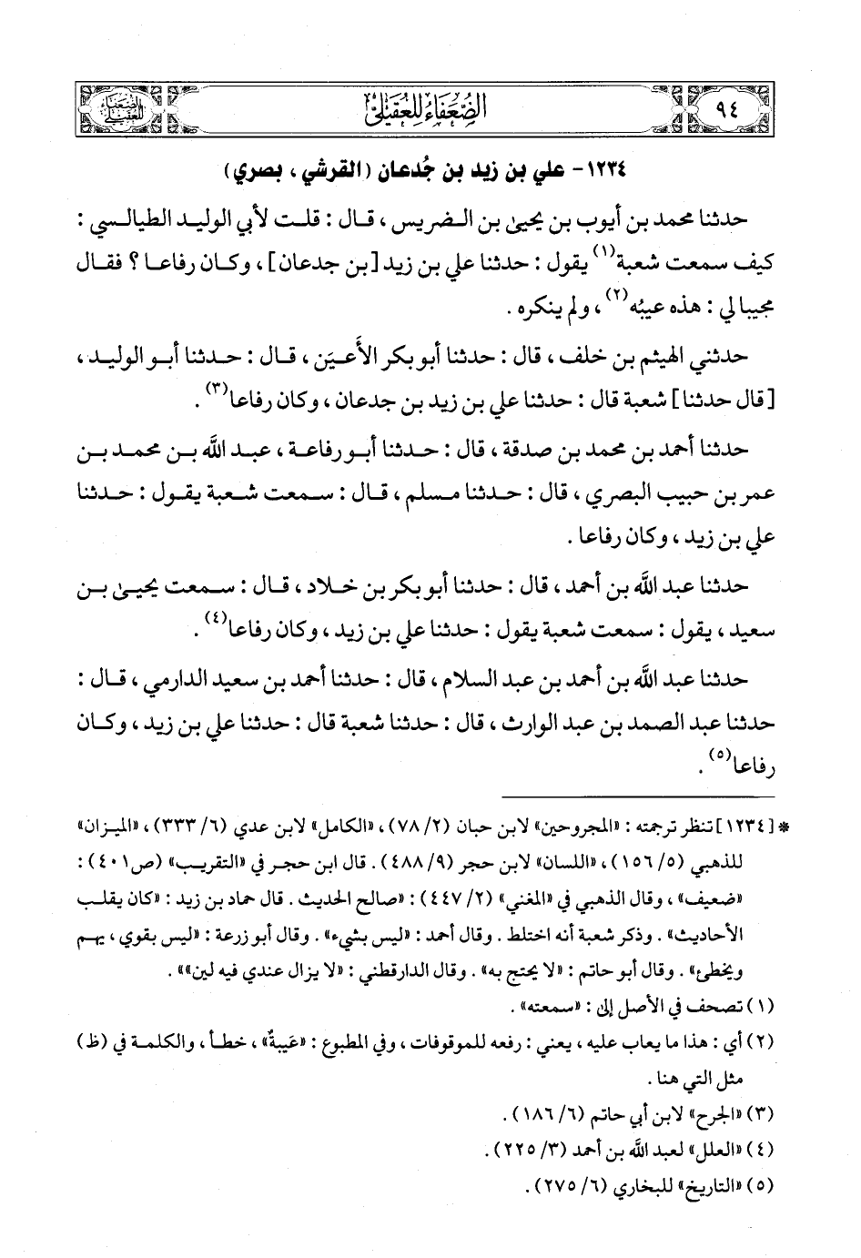 حدثني الهيثم بن خلف، قال: حدثنا أبو بكر الأَعيَن، قال: حدثنا أبو الوليد، [قال حدثنا] شعبة قال: حدثنا علي بن زيد بن جدعان، وكان رفاعا (4).