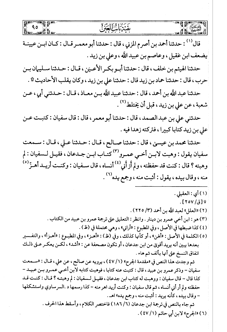ثم وجدت هذا النص في «مقدمة الجرح» (1/ 47)، يرويه عن صالح، عن علي، قال: «سمعت سفيان - وذكر عمرو بن عبيد، قال: كتبت عنه كتابا، فوهبت كتابه لابن أخي عمرو بن عبيد - كذا قال - قال سفيان: ووهبت له كتاب ابن جدعان، فقيل لسفيان: لم وهبته ؟ قال: كنت قد حفظته ولم أر أني أنساه، ثم قال سفيان: وكنت أريد اهر منه - كذا رسمها د. السرساوي واستشكلها - وقال بيده، كأنه يريد: أثبت منه، وجمع يده» اهـ.