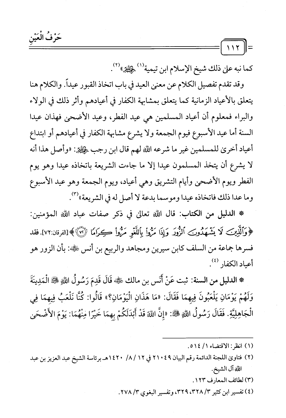 * الدليل من الكتاب: قال الله تعالى في ذكر صفات عباد الله المؤمنين: {وَالَّذِينَ لَا يَشْهَدُونَ الزُّورَ وَإِذَا مَرُّوا بِاللَّغْوِ مَرُّوا كِرَامًا (٧٢)} [الفرقان: ٧٢]. فقد فسرها جماعة من السلف كابن سيرين ومجاهد والربيع بن أنس - رضي الله عنه -: بأن الزور هو أعياد الكفار (¬٤).