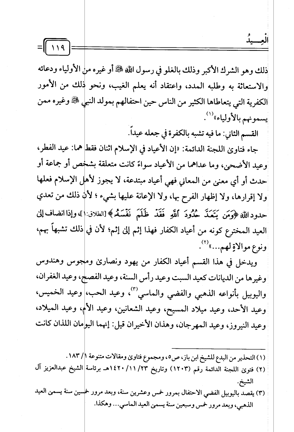 جاء فتاوى اللجنة الدائمة: "إن الأعياد في الإسلام اثنان فقط هما: عيد الفطر، وعيد الأضحى، وما عداهما من الأعياد سواءً كانت متعلقة بشخص أو جماعة أو حدث أو أي معنى من المعاني فهي أعياد مبتدعة، لا يجوز لأهل الإسلام فعلها ولا إقرارها، ولا إظهار الفرح بها، ولا الإعانة عليها بشيء؛ لأذلك من تعدي حدود الله {وَمَنْ يَتَعَدَّ حُدُودَ اللَّهِ فَقَدْ ظَلَمَ نَفْسَهُ} [الطلاق:١]، وإذا انضاف إلى العيد المخترع كونه من أعياد الكفار فهذا إثم إلى إثم؛ لأن في ذلك تشبهًا بهم، ونوع موالاةٍ لهم ... " (¬٢).