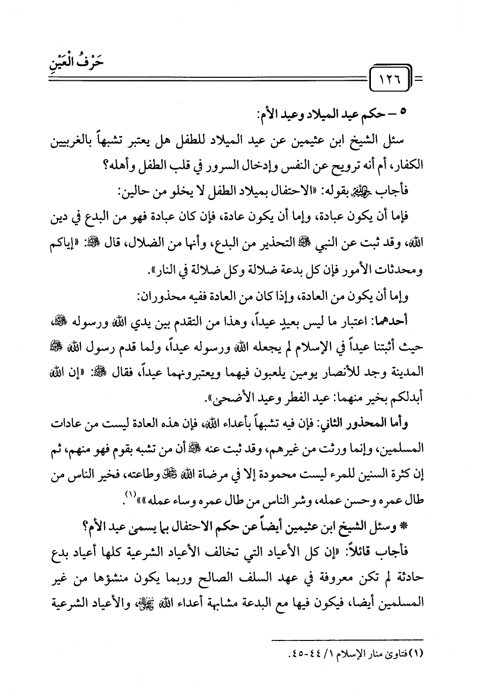 فأجاب قائلًا: "إن كل الأعياد التي تخالف الأعياد الشرعية كلها أعياد بدع حادثة لم تكن معروفة في عهد السلف الصالح وربما يكون منشؤها من غير المسلمين أيضا، فيكون فيها مع البدعة مشابهة أعداء الله سبحانه وتعالى، والأعياد الشرعية