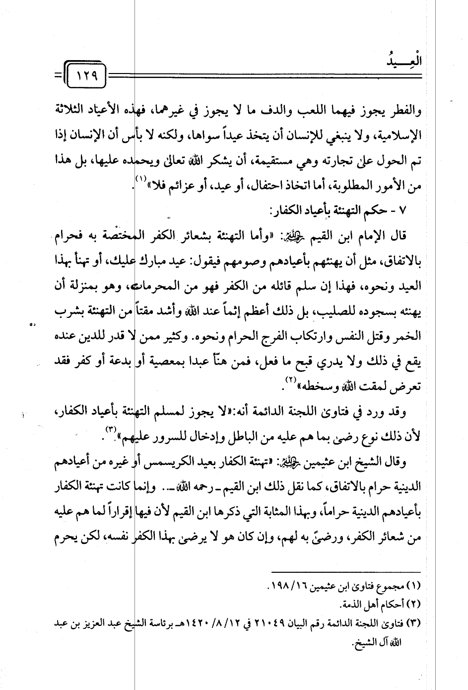 وقال الشيخ ابن عثيمين رحمه الله: "تهنئة الكفار بعيد الكريسمس أو غيره من أعيادهم الدينية حرام بالاتفاق، كما نقل ذلك ابن القيم - رحمه الله - .. وإنما كانت تهنئة الكفار بإعيادهم الدينية حرامًا، وبهذا المثابة التي ذكرها ابن القيم لأن فيها إقرارًا لما هم عليه من شعائر الكفر، ورضى به لهم، وإن كان هو لا يرضى بهذا الكفر نفسه، لكن يحرم