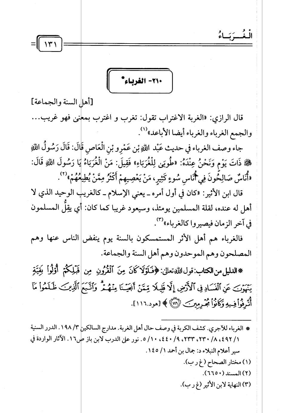 * الغرباء للآجري. كشف الكربة في وصف حال أهل الغربة. مدارج السالكين ٣/ ١٩٨. الدرر السنية ١/ ٤٩٢، ٨/ ٢٣٠، ٢٣٣، ٩/ ٤٤٠، ١٠/ ٥. نور على الدرب لابن باز ١٦. الآثار الواردة في سير أعلام النبلاء د: جمال بن أحمد ١/ ١٤٥.