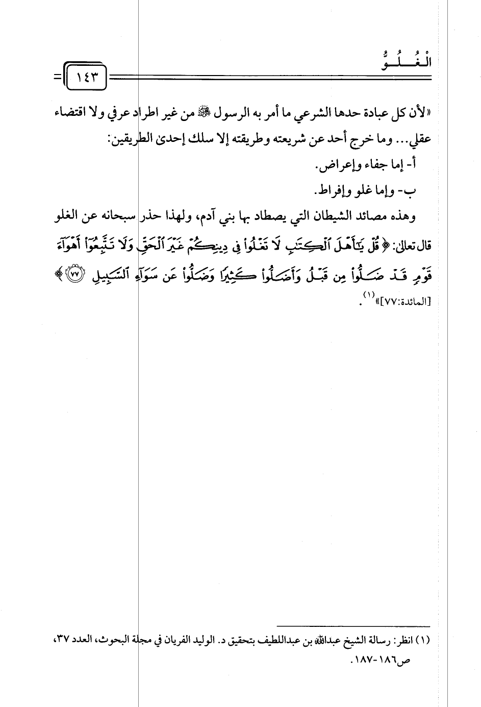 وهذه مصائد الشيطان التي يصطاد بها بني آدم، ولهذا حذر سبحانه عن الغلو قال تعالى: {قُلْ يَاأَهْلَ الْكِتَابِ لَا تَغْلُوا فِي دِينِكُمْ غَيْرَ الْحَقِّ وَلَا تَتَّبِعُوا أَهْوَاءَ قَوْمٍ قَدْ ضَلُّوا مِنْ قَبْلُ وَأَضَلُّوا كَثِيرًا وَضَلُّوا عَنْ سَوَاءِ السَّبِيلِ (٧٧)} [المائدة: ٧٧] " (¬١).