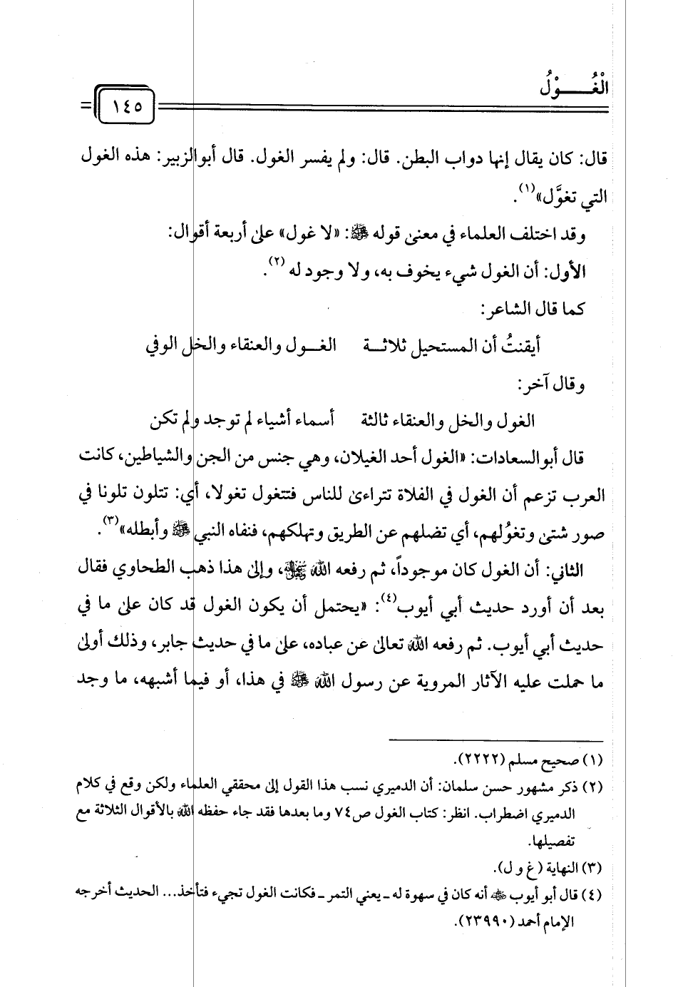 وقد اختلف العلماء في معنى قوله - صلى الله عليه وسلم -: "لا غول" على أربعة أقوال: