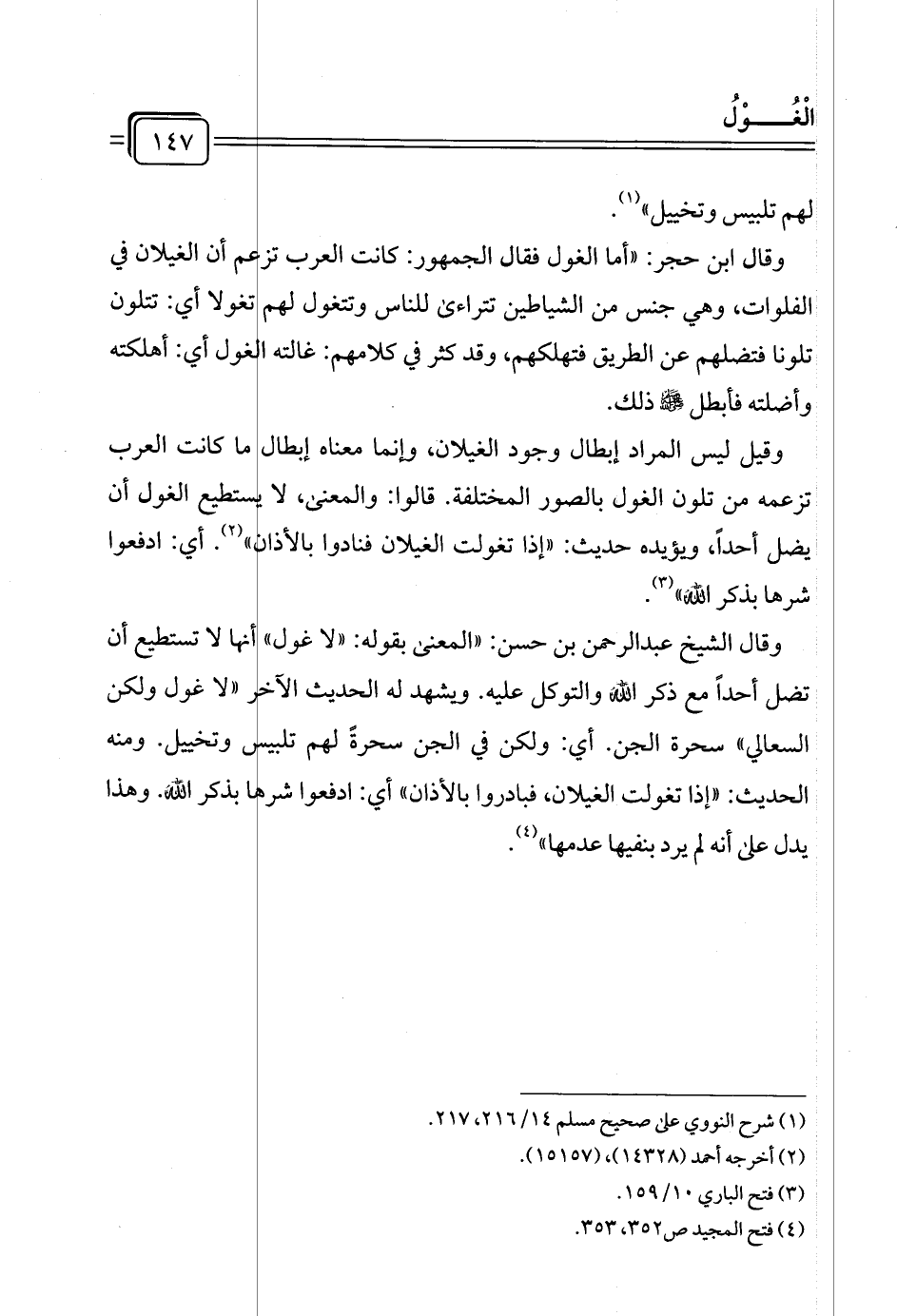 وقال الشيخ عبد الرحمن بن حسن: "المعنى بقوله: "لا غول" أنها لا تستطيع أن تضل أحدًا ذكرى الله والتوكل عليه. ويشهد له الحديث الآخر "لا غول ولكن السعالي" سحرة الجن. أي: ولكن في الجن سحرةً لهم تلبيس وتخييل. ومنه الحديث: "إذا تغولت الغيلان، فبادروا بالأذان" أي: ادفعوا شرها بذكر الله. وهذا يدل على أنه لم يرد بنفيها عدمها" (¬٤).